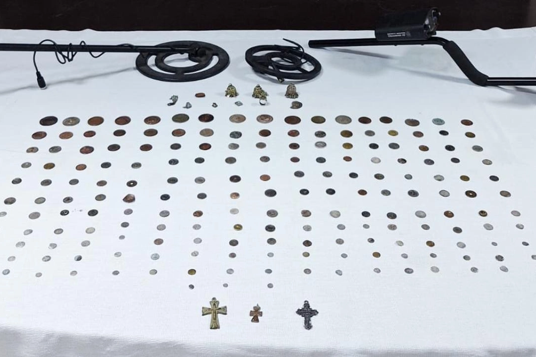 Kınık'ta belirlenen adrese baskın düzenleyen ekipler, Roma, Helenistik ve Bizans dönemine ait olduğu değerlendirilen 190 sikke, 10 obje, 3 demir haç ve metal arama dedektörü ele geçirdi.