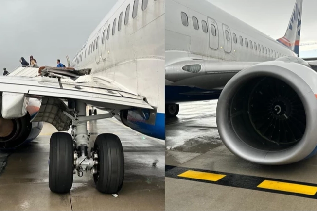 TC-SOB tescilli Boeing 737 tipi yolcu uçağının iniş takımları kırıldı. Kanadı delinen ve sola yatan uçak, jet motoru yere sürterek durdu.
