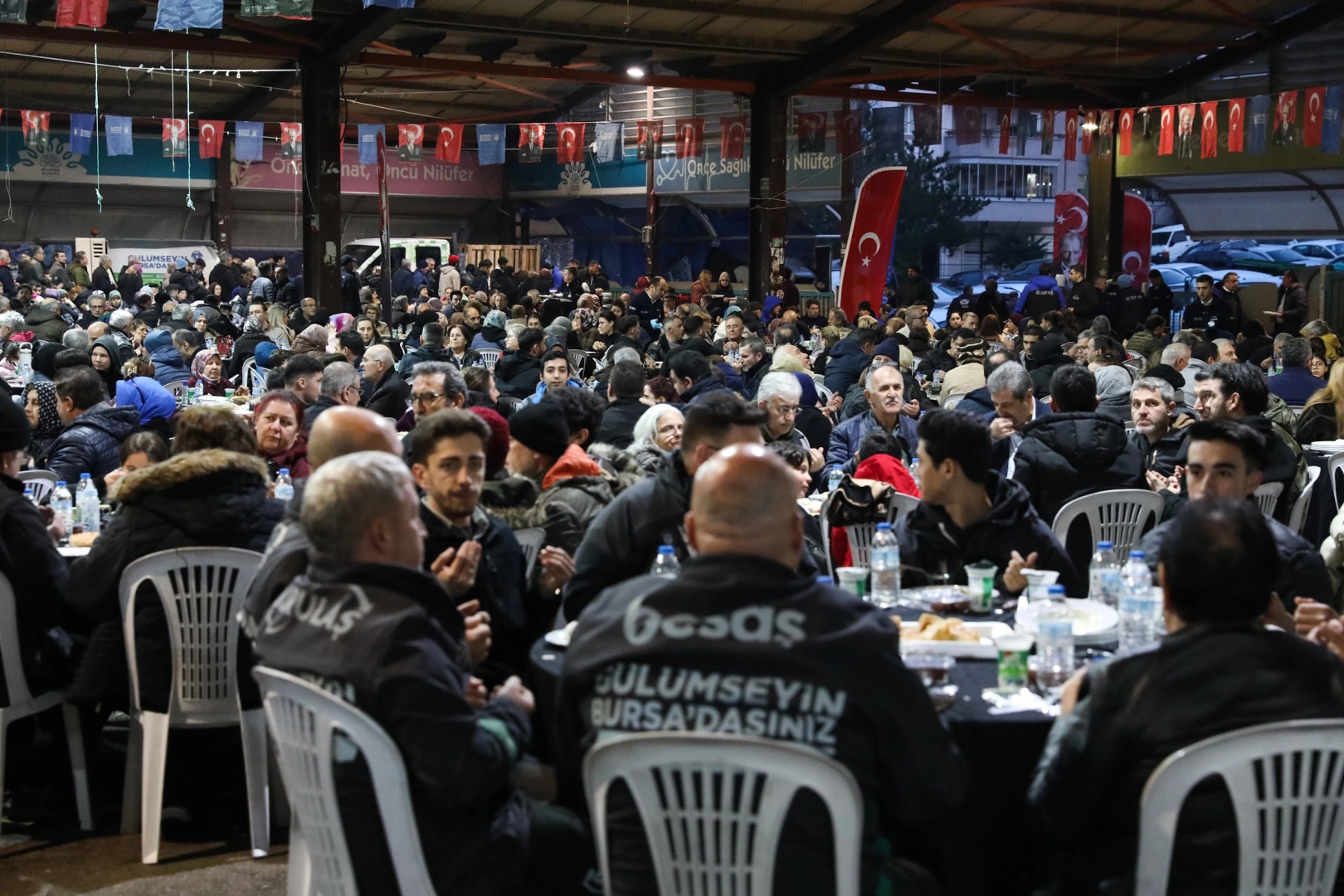 Bursa Büyükşehir Belediyesi tarafından Konak Kapalı Pazar Alanı’nda gerçekleştirilen programa, Büyükşehir Belediyesi Başkanvekili Mehmet Aydın Saldız ve Yalçın Işıkyıldız, CHP Nilüfer İlçe Başkanı Özgür Şahin, Büyükşehir Belediyesi bürokratları, muhtarlar, sivil toplum kuruluşlarının temsilcileri ve belediye meclis üyeleri de katıldı. Vatandaşların yoğun ilgi gösterdiği programda, akşam ezanının okunmasıyla hep birlikte oruçlar açıldı. Konuşmasına Bursa Büyükşehir Belediye Başkanı Mustafa Bozbey’in selamlarını ileterek başlayan Başkanvekili Mehmet Aydın Saldız, dayanışma, paylaşma ve kardeşlik ruhunu Ramazan ayında yoğun bir şekilde yaşadıklarını söyledi. İlçelerde iftar programı düzenleyerek, 14 noktada iftariyelik dağıtarak, 4 sabit iftar noktasında yemek ikram ederek Ramazan’ın bereketini kentin her yerine taşıdıklarını belirten Saldız, Ramazan ayının dünyaya ve bölgeye de huzur getirmesini temenni etti. CHP Nilüfer İlçe Başkanı Özgür Şahin, tüm vatandaşların Ramazan ayını tebrik ederek iftar programı düzenleyen Başkan Mustafa Bozbey’e teşekkür etti.