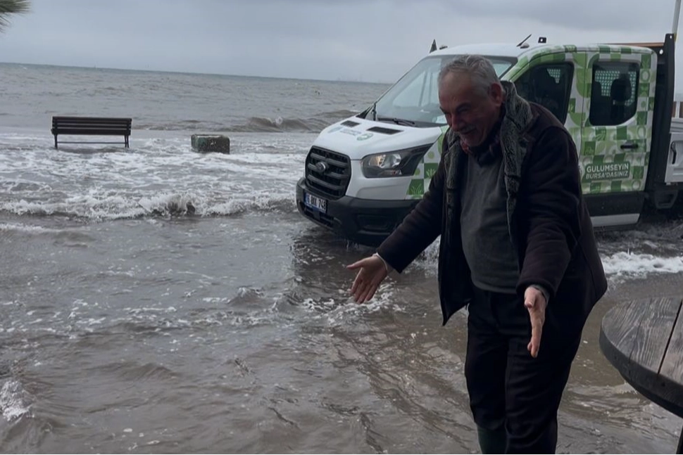 Gemlik'e bağlı Kurşunlu Mahallesi'nde sabah saatlerinde etkisini artıran fırtına sonrası deniz taştı. Sahil şeridindeki işletmeler kapılarını açamazken, deniz suyu kumları da beraberinde getirerek iş yerlerinin girişine kadar dayandı. Mahalle Muhtarı Hüseyin Ormancılar, sahil şeridindeki işletmeleri ziyaret ederek incelemelerde bulundu. İşletme sahipleri ve çalışanların tedirgin bekleyişi sürerken Ormancılar, "Deniz buraya kadar gelmiş, kumları da getirmiş. Birazdan balıklar da gelir" dedi. Muhtar ile esnaf arasında geçen diyaloglar kameralara yansıdı.