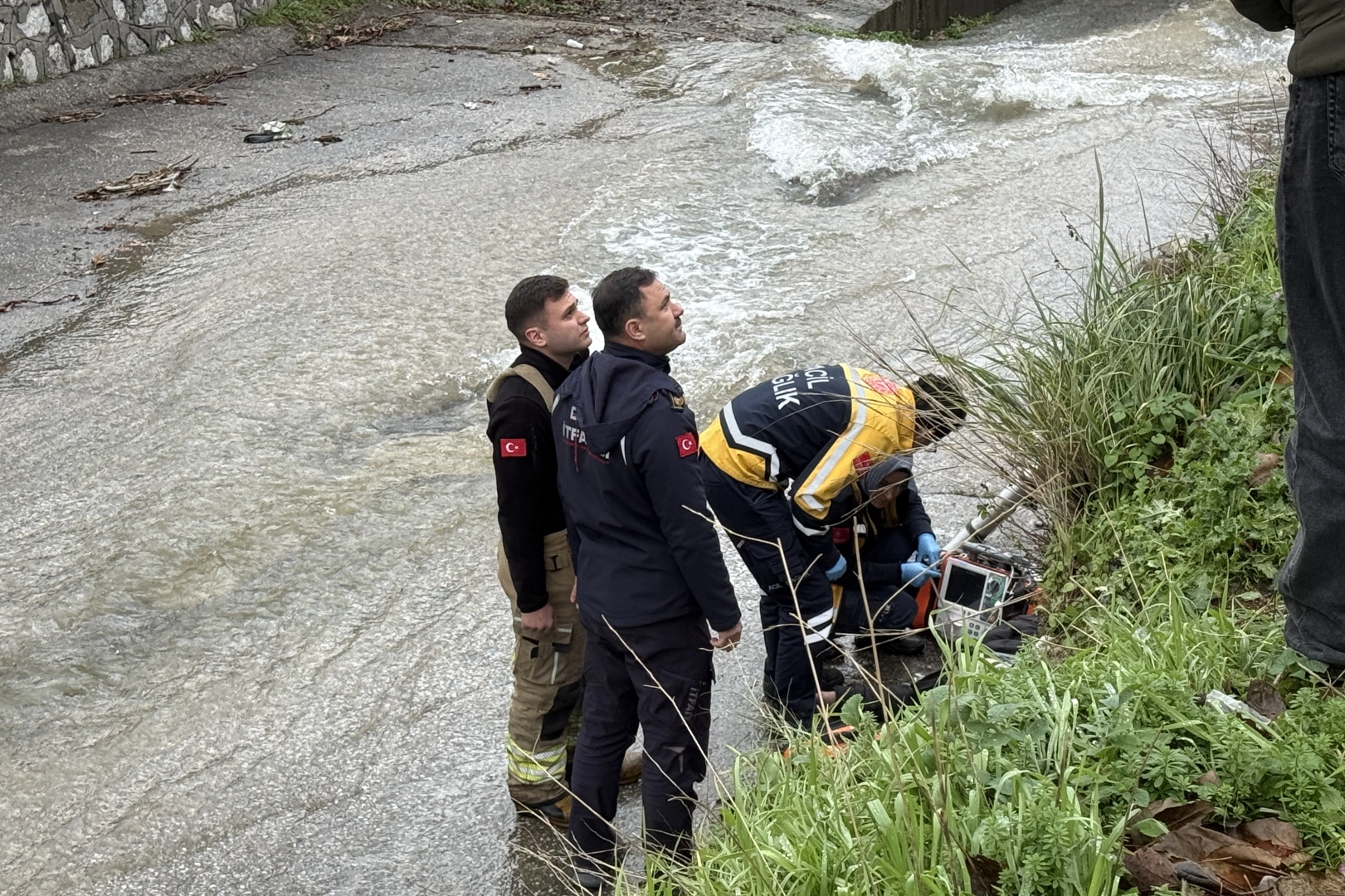 İtfaiye merdiveniyle dere yatağına giren ekipler, bu kişinin hayatını kaybettiğini belirledi.