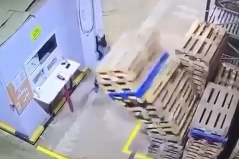 Olay, Bursa'nın Organize Sanayi Bölgesi'nde bulunan bir fabrikada meydana geldi. Edinilen bilgiye göre, depo içinde bulunan bir işçi forkliftle yüklediği paletleri üst üste istiflemek istedi. Ancak son bıraktığı parti dengesiz olunca, paletler yere devrildi. O sırada forkliftin hemen yanında bulunan kadın çalışan, devrilen paletlerin altında kalmaktan kıl payı kurtuldu. O anlar kameraya yansıdı.