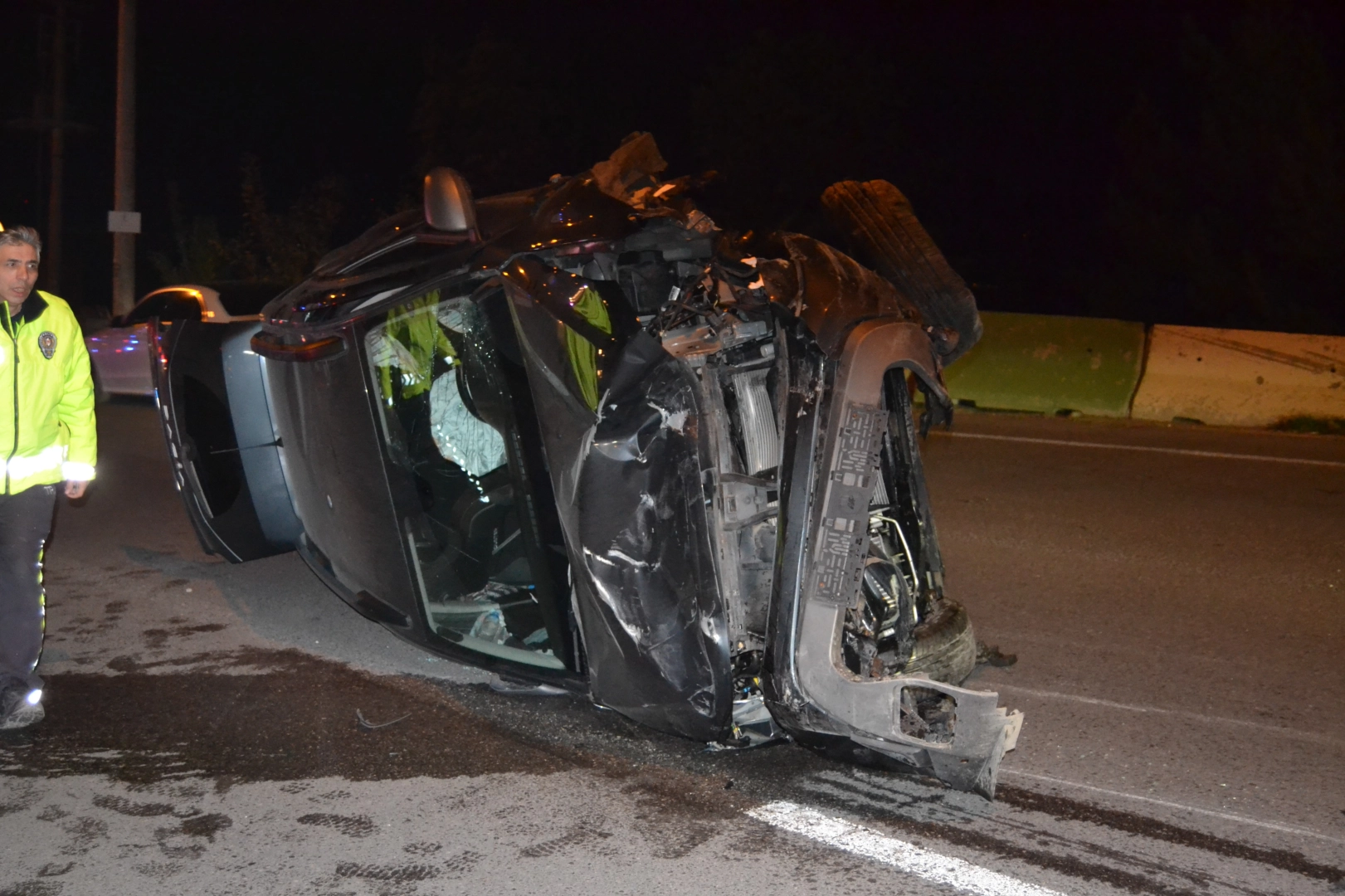 Kaza, saat 00.50 sıralarında Mudanya Devlet Hastanesi mevkii Tepedevrent kavşağı yakınlarında, Mudanya istikametine giden yolda meydana geldi. Edinilen bilgiye göre, 16 ASE 131 plakalı otomobiliyle seyir halinde olan Süleyman Gül (75), normal seyrine devam ettiği sırada arkasından gelen 16 DC 012 plakalı aracın sürücüsü Orhan, henüz belirlenemeyen bir nedenle direksiyon hakimiyetini kaybetti. Kontrolden çıkan araç önce yol kenarındaki beton bariyere çarptı, ardından öndeki araca arkadan çarparak takla attı. Çarpmanın şiddetiyle savrulan araç, taklalar atarak yaklaşık 100 metre ileriye sürüklendi ve yan şekilde durabildi. Kazanın etkisiyle bölgedeki aydınlatma direği devrildi, beton bariyerlerde hasar oluştu. Yolun güvenliği sağlanana kadar trafik ekipleri bölgeyi kısa süreliğine araç geçişine kapattı. İhbar üzerine olay yerine polis, sağlık ve itfaiye ekipleri sevk edildi. Yaralanan iki kişi sağlık ekiplerinin ilk müdahalesinin ardından ambulanslarla Mudanya Devlet Hastanesi'ne kaldırıldı. Takla atan aracın çalışır halde olduğu belirlenince itfaiye ekipleri güvenlik önlemleri aldı. Kaputu açarak akü bağlantısını kesen ekipler, muhtemel bir yangın veya patlama riskini önledi. Kaza yapan araçlar çekicilerle yoldan kaldırılırken, devrilen direk ve etrafa saçılan parçaların temizlenmesinin ardından trafik yeniden normale döndü. Polis ekipleri kazayla ilgili soruşturma başlattı.