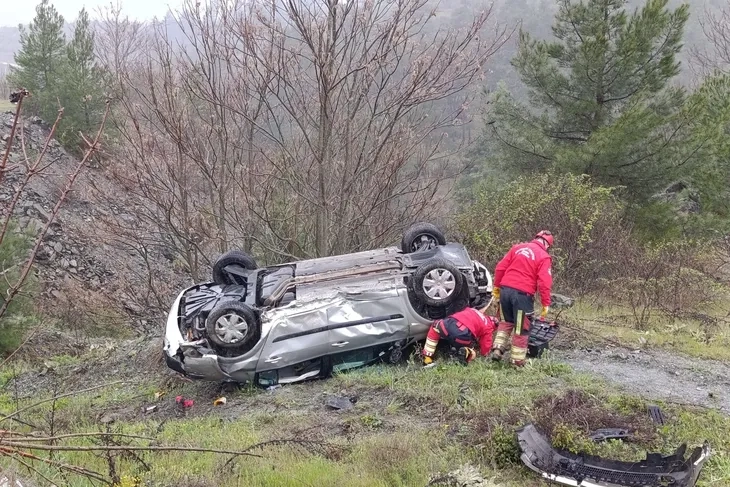 Dursunbey-Kütahya kara yolunda seyreden plakası ve sürücüsünün kimliği henüz öğrenilemeyen otomobil, kontrolden çıkarak devrildi.