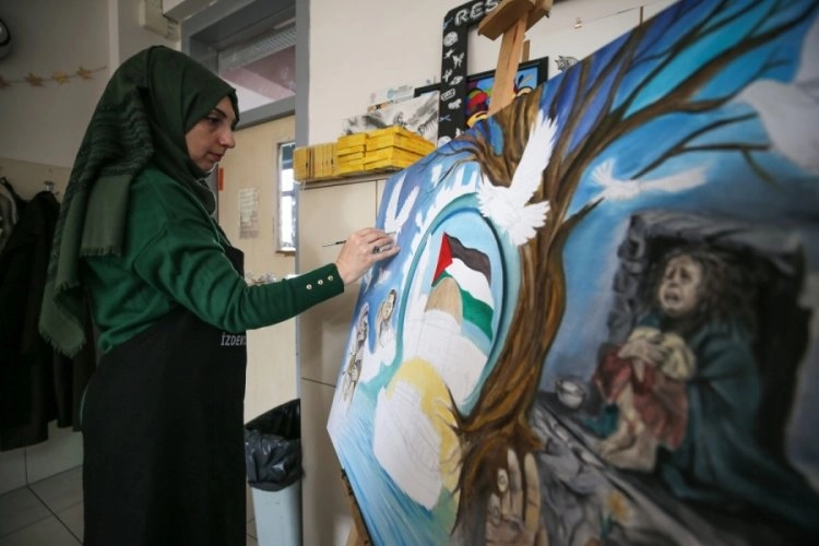 Okulun görsel sanatlar öğretmenlerinden İzden Coşkun da etkinliğe 10. ve 11. sınıf öğrencilerinin katıldığını ve Filistin halkının uğradığı zulmü sanatın evrensel diliyle anlatmaya çalıştıklarını dile getirdi.
