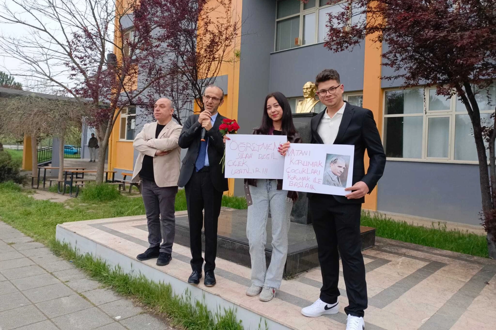 Öğrenciler, ‘öğretmene silah değil, çiçek uzatılır' ve ‘Vatanı korumak çocukları korumaktan başlar' pankartlarıyla arkadaşlarını karışlayan öğrenciler, ayrıca tüm öğretmen ve öğrencilere karanfil dağıttı. Öğrencilerinin bu duyarlılığının kendilerini çok duygulandırdığını ifade eden Şehit Erol Olçok Turizm Mesleki ve Teknik Anadolu Lisesi Müdür Yardımcısı Mehmet Niyazi Köse, "Eğitimci olarak bizler on iki günde meslek hayatlarının en zor dönemini yaşadık. Bu süreç öğrencilerimiz için çok daha zordu. Ancak onlar kendi zorluklarını unutarak arkadaşlarına ve bizlere büyük bir sürpriz yaptı. Kendileri küçük de olsa kalplerinin ne kadar büyük olduğunu bize gösterdiler. Bizim tahayyül ettiğimiz Türk Gençliği işte tam olarak budur. Öğrencilerimiz kutluyor ve onların öğretmenleri olmaktan gurur duyuyoruz" dedi.