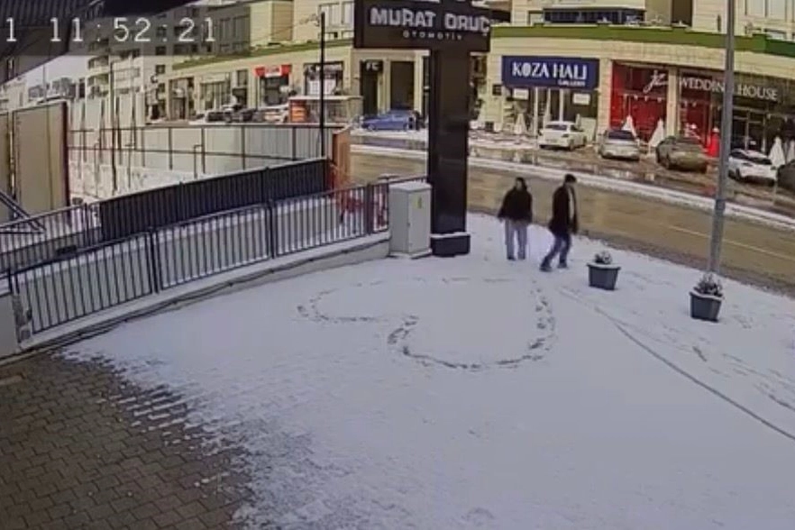 Soğuk havanın etkili olduğu kentte, karla kaplanan kaldırımda yürüyen sevgili bir çift, romantik bir an yaşadı. Çift, yerde biriken karın üzerine kalp çizerek sevgilerini ifade etti. O anlar ise çevrede bulunan bir iş yerinin güvenlik kamerası tarafından saniye saniye kaydedildi.