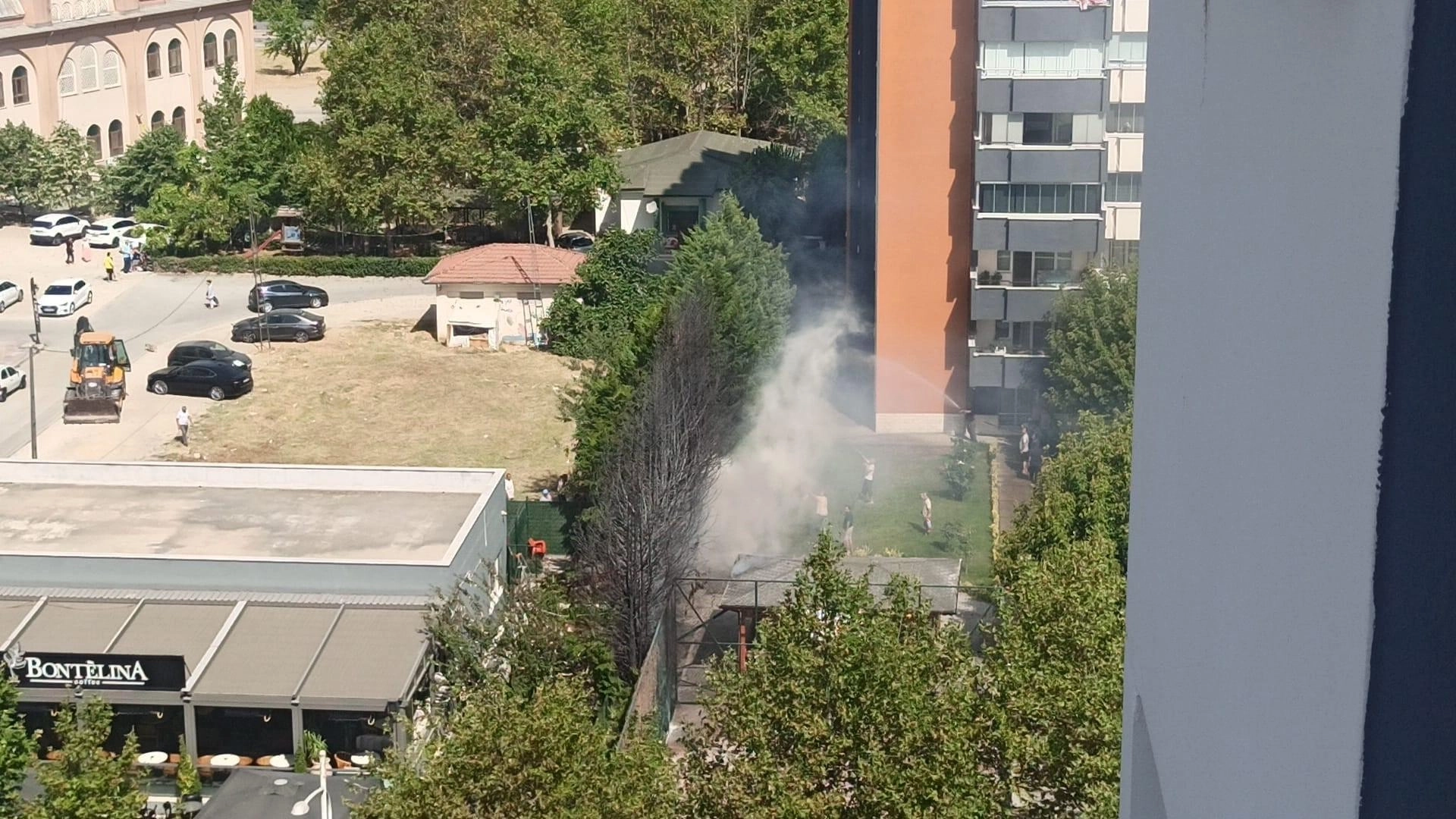 Yangın, Bursa'nın merkez Nilüfer ilçesi Yüzüncüyıl Mahallesinde meydana geldi. Edinilen bilgiye göre, mahallenin merkezinde yüksek katlı binaların olduğu bölgesinde bulunan kafenin yanındaki ağaçlar birden alev aldı. Ağaçların alev almasıyla çevresindeki site sakinleri ve kafenin bulunduğu alandaki esnaf, büyük korku yaşadı. Esnaf yangın tüpleriyle müdahale ederken, sitelerden uzatılan hortumlarla alevlerin büyümesi önlendi.Olay yerine kısa sürede gelen 112 itfaiye ekipleri, alevleri söndürdü. Olayla ilgili tahkikat devam ediyor.
