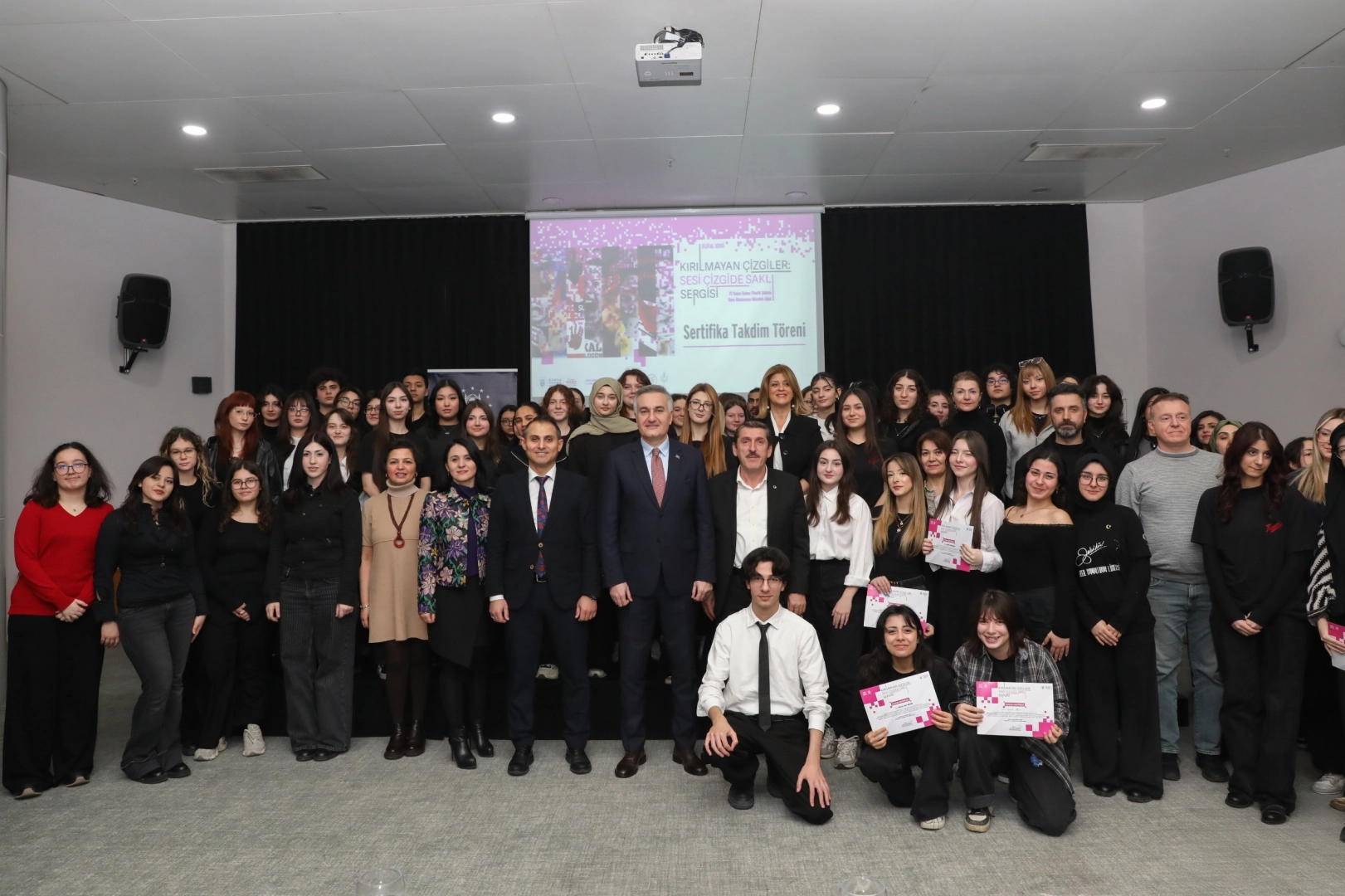 Bursa Büyükşehir Belediyesi’nin ‘Fark Et, Oyna, Dönüştür’ teması ile gençler için düzenlenen atölye çalışmalarını dijital dünya ile buluşturduğu ‘Kırılmayan Çizgiler’ temalı dijital sergi, 25 Kasım Kadına Yönelik Şiddete Karşı Uluslararası Mücadele Günü kapsamında Bursalılarla buluşturulmuştu. Zeki Müren Güzel Sanatlar Lisesi ile Feriha Uyar Mesleki ve Teknik Anadolu Lisesi öğrencilerinin sanatsal üretimlerinden oluşan ve 110 eserin yer aldığı dijital sergi, öğrencilerin eşitlik ve şiddetsiz yaşam mesajını taşıyor. Dijital afiş sergisi kapsamında eser üreten öğrencilere, Atatürk Kültür Merkezi Merinos Yerleşkesi’nde düzenlenen törenle sertifikaları verildi. Programa, Bursa Büyükşehir Belediye Başkanı Mustafa Bozbey’i temsilen Bursa Büyükşehir Belediyesi Başkanvekili Mustafa Orkun Gazioğlu, okul yöneticileri, öğretmenler ve öğrenciler katıldı. Kadına yönelik şiddetle mücadelenin toplumsal dönüşümle mümkün olabileceğine dikkat çeken Başkanvekili Mustafa Orkun Gazioğlu, gençlerin çizgilerle ve dijital üretimlerle verdiği mesajların eşit ve şiddetsiz bir toplum yolunda son derece değerli olduğunu söyledi. Serginin estetik bir üretimin ötesinde, gençlerin dünyaya söyledikleri sözü görünür kılan güçlü bir anlatı olduğunu ifade eden Gazioğlu, “Bu çalışmalar, duyarlılığın, cesaretin ve özgür düşüncenin çizgiyle, renkle ve tasarımla kurduğu ortak bir dildir. Bursa Büyükşehir Belediyesi olarak gençlerin sözünü çoğaltan her çalışmayı desteklemeye devam edeceğiz” dedi.