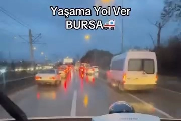 Bursa’da iş çıkışı ve iftar saatine yakın yoğun trafikte ilerlemeye çalışan ambulansa sürücüler örnek bir davranış sergileyerek yol verdi. O anlar ambulansın araç kamerasına yansıdı.