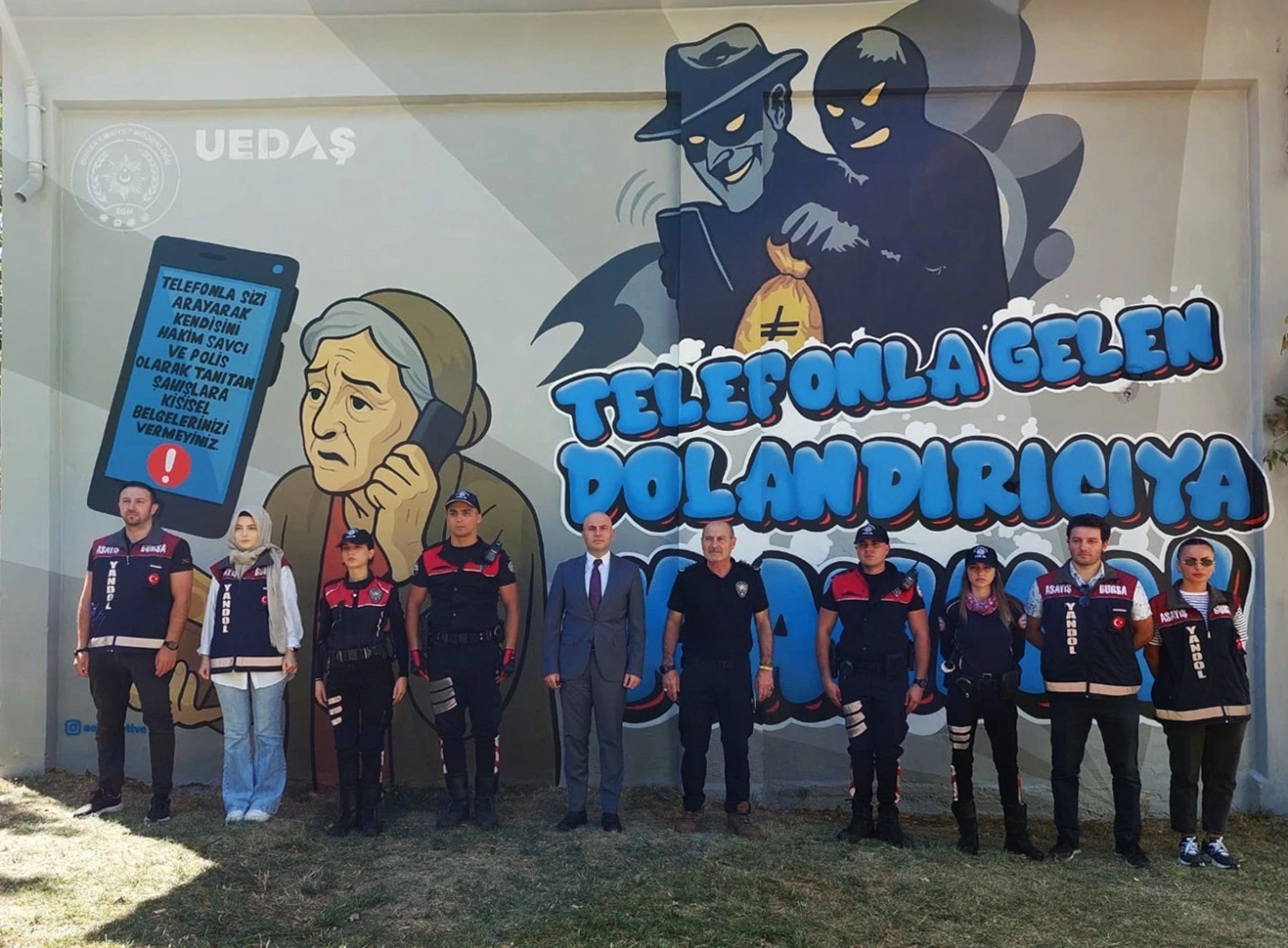 Proje kapsamında Bursa Nene Hatun Caddesi üzerindeki trafoya, "Telefonla gelen dolandırıcıya kanma!" mesajı grafiti sanatıyla işlendi. Etkinliğe katılan Bursa İl Emniyet Müdürü Dr. Sabit Akın Zaimoğlu’nun da yer aldığı çalışmada açıklama yapan UEDAŞ Genel Müdürü Cihangir Gençoğlu şunları söyledi;"Bugüne kadar 74 trafomuzu toplumsal farkındalık için grafiti ile renklendirdik. Bu projeyi İl Emniyet ve Asayiş Müdürlüğümüzle birlikte hayata geçirdik. Trafolarımız, gün içinde birçok insanın önünden geçtiği noktalarda yer alıyor. Biz de bu noktada duyarlılık oluşturmayı amaçlıyoruz. Tüm paydaşlarımıza teşekkür ediyoruz."Bursa’da dolandırıcılık vakalarının arttığına dikkat çeken Bursa İl Emniyet Müdür Yardımcısı Suvat Sezer ise şu ifadeleri kullandı;