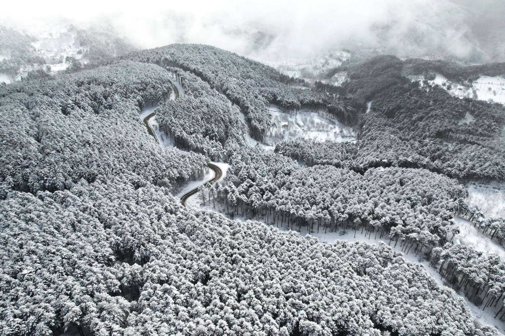 Kış mevsiminin etkisiyle beyaza bürünen ormanlık alanlar arasında ilerleyen yollar, havadan çekilen görüntülerde kartpostallık kareler oluşturdu.