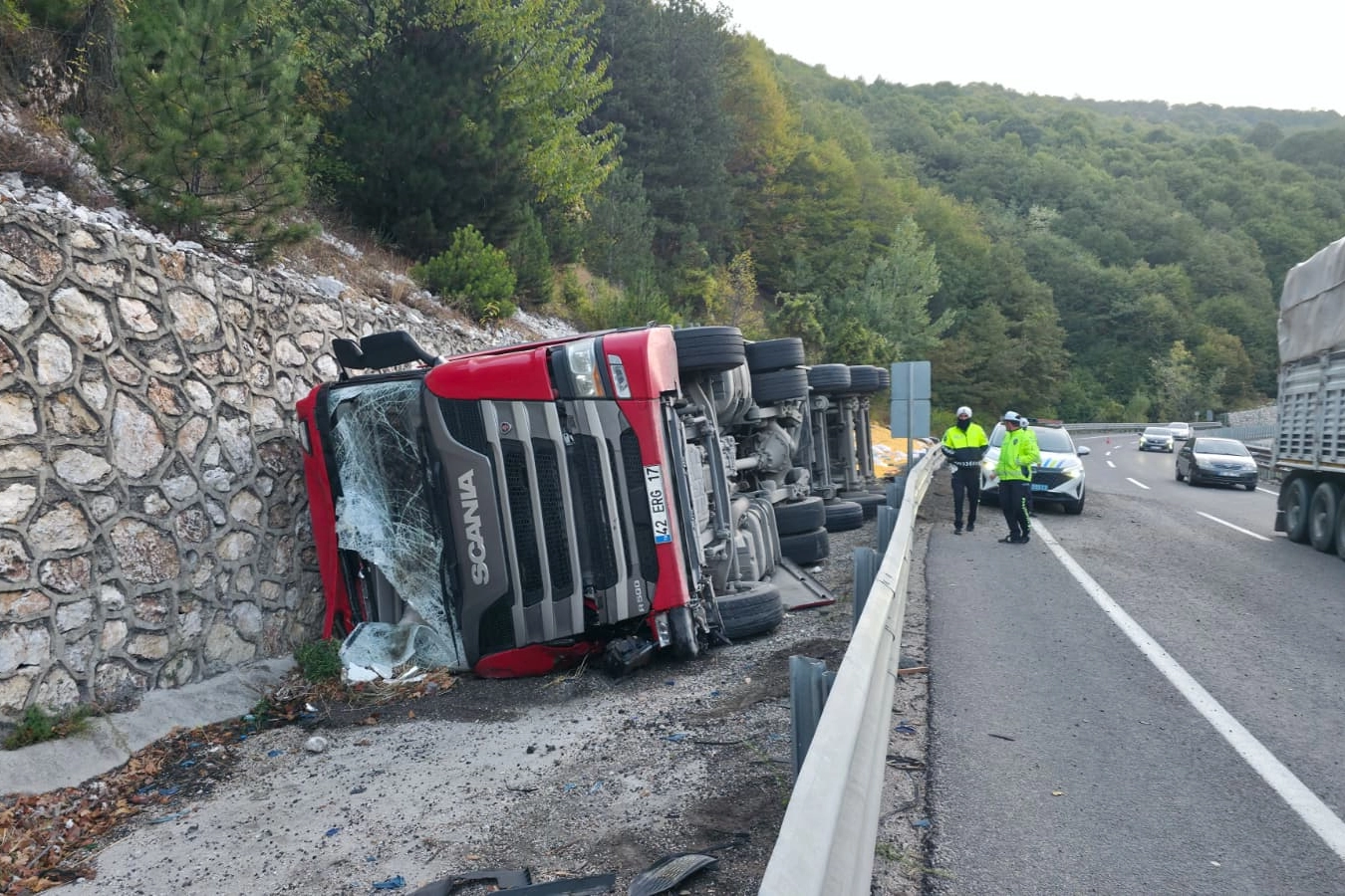 Ahmet S. yönetimindeki 42 ERG 17 plakalı hayvan yemi yüklü tır, Güney Kestane mevkisinde devrildi.