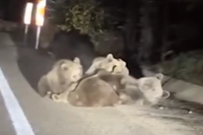 Kayıtlarda, yolun kenarına yatan anne ayının 3 yavrusunu emzirdiği görülüyor.