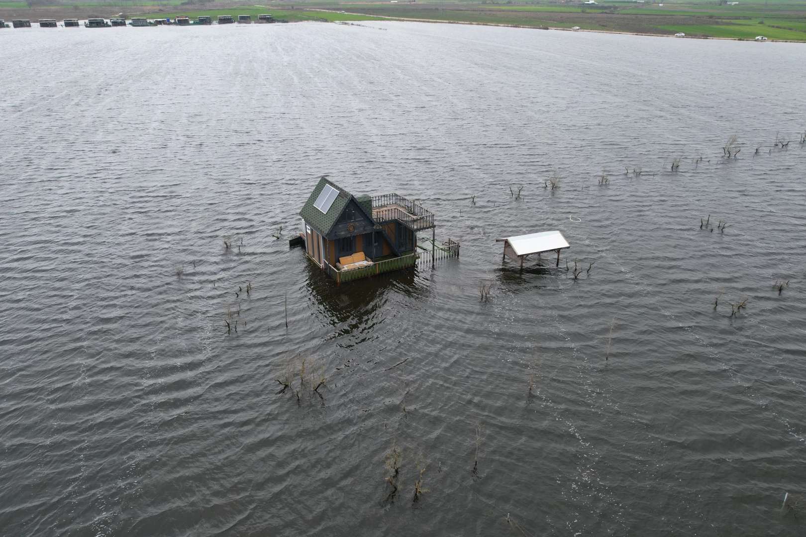 Bursa'da Ulubat Gölü'nün taşmasıyla göle komşu Akçalar Mahallesi'nde onlarca tiny house ve hobi evi sular altında kaldı. Göl havzasının ne denli geniş bir alan yayıldığı havadan gözler önüne serildi.
