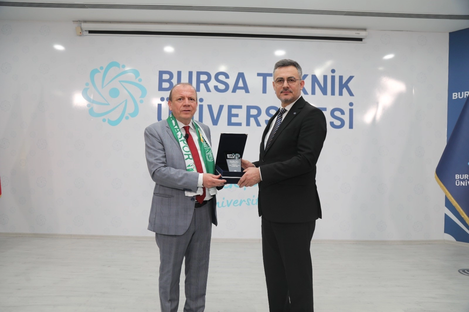 "Neyi seviyorsanız onu yapın"Öğrencilere, hayatlarının her alanında mutluluğu merkeze almaları gerektiğini hatırlatan Özer Matlı, "Kendinizi nerede ve neyi yaparken mutlu hissediyorsanız, onu yapın. Sevdiğiniz iş neyse onun peşinden gidin. Başarı, sizin ellerinizde. Sadece iş insanı olmanıza gerek yok, yeter ki bir değer üretin" dedi."Bu bayrağın altında birlikte başaracağız"Ortak hareket etmenin, birlikte üretmenin ve yardımlaşmanın önemine değinen Özer Matlı, bireysel yaşam biçiminin, toplum için tehlikeli boyutlara geldiğine dikkat çekti. Matlı, "Eğer yardımlaşmayı başarabilirsek, eğitimde ve iş hayatında çok daha iyi yerlere geliriz. Dünya ekonomisinin rotası Türkiye’ye dönebilir" sözleriyle iş birliğinin gücünü vurguladı.Bursa’ya destek, gençlere ilhamKonuşmasında futbolla ilgisi olmamasına rağmen Bursaspor’a verdiği desteği de dile getiren Matlı, "Şehirde 1. ligden 3. lige düşmüş bir takım vardı. Futbolla ilgim yok ama şehirli olmanın sorumluluğuyla hareket ettim. İyi ki samimi duygularla Bursaspor’a destek verdim. Onlar da şehrin yüzünü güldürdü. Şehrin değerlerine sahip çıkmak, yaptığım en huzurlu işlerden biri oldu" ifadelerini kullandı."Her şey sizde bitiyor"Başkan Özer Matlı, konuşmasını şöyle noktaladı:"Sizlerdeki değişim bu ülkeyi değiştirecek, geliştirecek. Sizler bugün bu ülkenin proje havzası olan Bursa Teknik Üniversitesinde öğrenim görüyorsunuz, bunun kıymetini bilip, kendinizle gurur duymalısınız. Bugünkü teknoloji ve eğitimle önünüzde engel yok. Sadece dünyada kaybolmaya yüz tutmuş temel değerleri yeniden birleştirmeliyiz."Matlı, öğrencilerden gelen soruları da yanıtladı. Program, BTÜ Rektörü Prof. Dr. Naci Çağlar’ın, Başkan Özer Matlı’ya plaket takdiminin ardından, toplu fotoğraf çekimiyle son buldu.