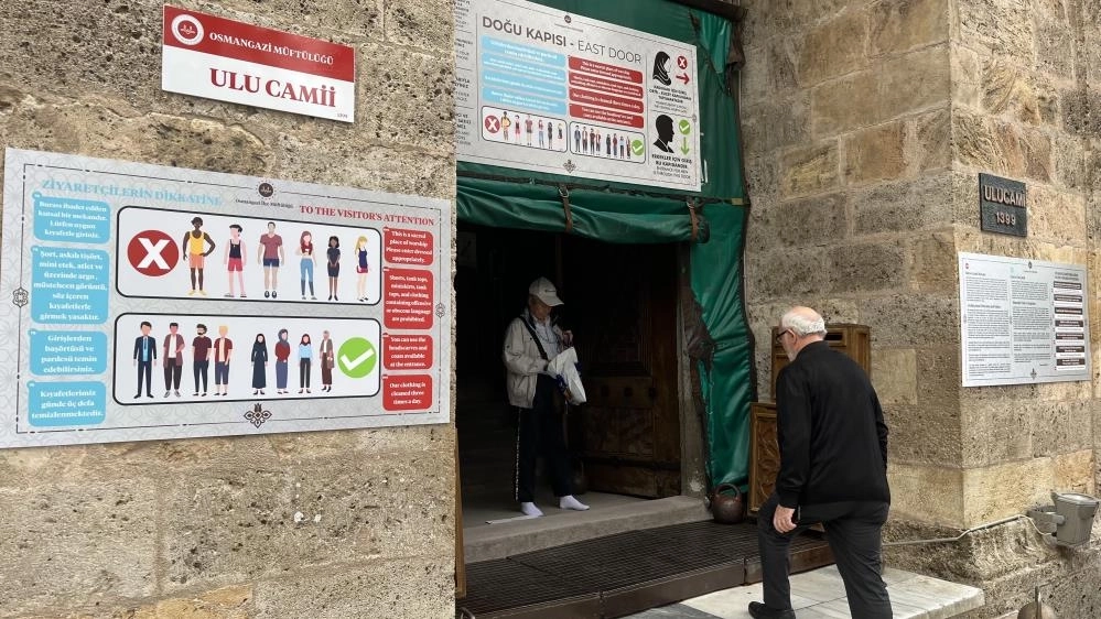 Ulu Cami'de yeni dönem başladı. Türkiye'nin en çok ziyaret edilen camilerinden biri olan Ulu Cami, artık sadece bir turistik durak değil; aynı zamanda adabın, saygının ve kültürel farkındalığın merkezi. Girişte yer alan uyarı levhaları ve mavi yelekli görevliler, ziyaretçilere nasıl giyinmeleri gerektiğini nazikçe anlatıyor. Uygun kıyafeti olmayanlara ise Diyanet Vakfı tarafından anında giysi temin ediliyor.