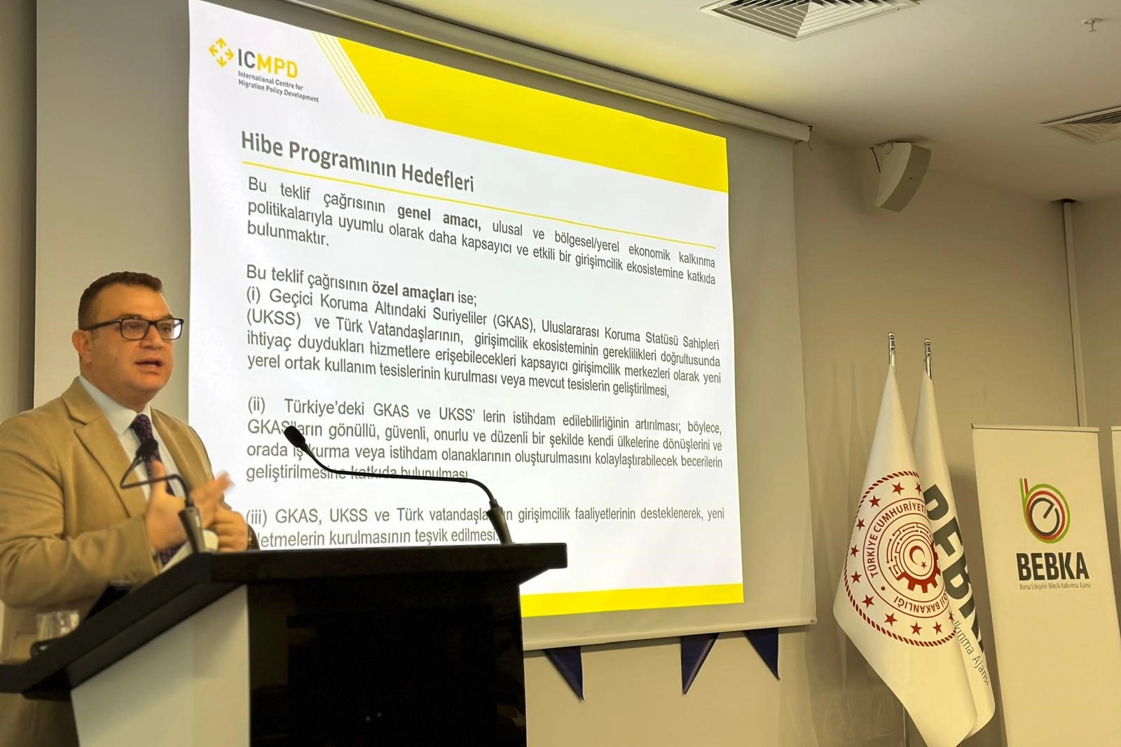 Toplantının açılışında konuşan BEBKA Genel Sekreter Vekili Sabri Bayram, kalkınma ajanslarının yalnızca finansman sağlayan kurumlar olmadığını vurgulayarak, yerelde iş birliklerini güçlendiren ve sürdürülebilir kalkınmayı destekleyen yapılar olarak faaliyet gösterdiklerini söyledi. Bayram, ortak kullanım altyapılarının uzun vadeli ve kalıcı etki oluşturduğuna dikkat çekerek, bu yaklaşımın bölgesel kalkınma açısından önemli sonuçlar doğuracağını ifade etti. HİBE PROGRAMI 18 İLDE UYGULANACAK Toplam 11 milyon avro bütçeye sahip olan hibe programı, aralarında Bursa'nın da bulunduğu 18 ilde uygulanacak. Program kapsamında uygun başvuru sahiplerine 150 bin ile 200 bin avro arasında hibe desteği sağlanacak, proje bütçesinin ise yüzde 90'ına kadar finansman imkânı sunulacak. Bilgilendirme toplantısında ICMPD Hibe Ekip Lideri Çağlar Aydın ile ICMPD Girişimcilik Lideri Deniz Karcı Korfalı tarafından programın kapsamı, başvuru şartları ve uygulama sürecine ilişkin detaylı sunumlar yapıldı. Katılımcılar, toplantının sonunda gerçekleştirilen soru-cevap bölümünde merak ettikleri konulara ilişkin bilgi aldı. Ticaret ve sanayi odaları, belediyeler, organize sanayi bölgeleri, teknoloji geliştirme merkezleri ve iş geliştirme merkezleri gibi kurumların başvurularına açık olan programın ortak kullanım altyapılarının geliştirilmesi, girişimcilik kapasitesinin artırılması ve sürdürülebilir sosyo-ekonomik uyuma katkı sağlaması hedefleniyor.