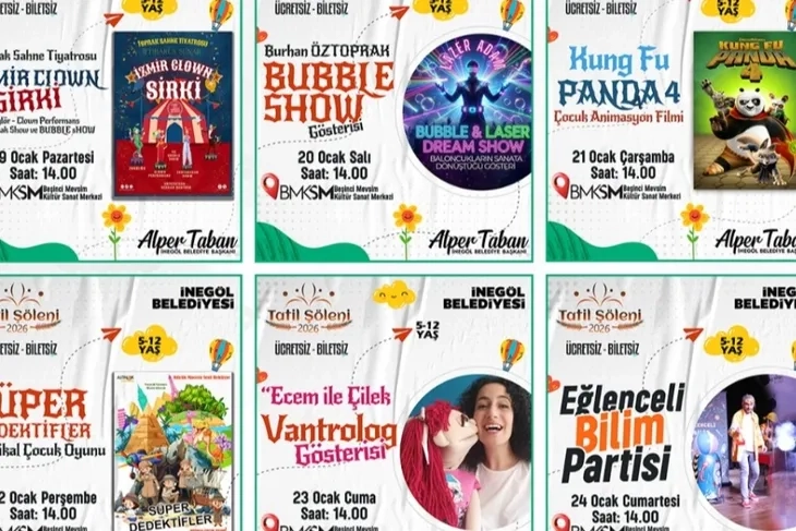 "Tatil Şöleni 2026" adıyla düzenlenen etkinlikler kapsamında tiyatrodan animasyona, bilim gösterilerinden sinema ve sahne şovlarına kadar birçok ücretsiz etkinlik çocuklarla buluşacak. 5-12 yaş grubuna yönelik olarak hazırlanan programlar, Beşinci Mevsim Kültür Sanat Merkezi’nde gerçekleştirilecek. Tüm etkinlikler ücretsiz ve biletsiz olarak izlenebilecek. İnegöl Belediye Başkanı Alper Taban, ara tatilde çocukların keyifli ve verimli vakit geçirmesini önemsediklerini belirterek, "Çocuklarımızın yüzünü güldürecek, hayal dünyalarını geliştirecek ve güzel hatıralar biriktirecekleri bir tatil programı hazırladık. Tüm çocuklarımızı Tatil Şöleni 2026 etkinliklerimize davet ediyorum." dedi.