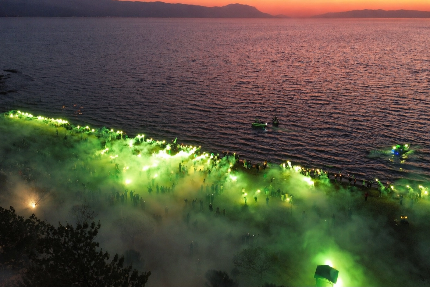 İznik Bursasporlular Derneği tarafından organize edilen şampiyonluk kutlamasında yeşil-beyaz renklere gönül veren çok sayıda taraftar bir araya geldi. İznik sahilinde gerçekleştirilen kutlamalarda meşaleler yakılırken, marşlar ve tezahüratlar eşliğinde büyük coşku yaşandı. Sahil boyunca oluşan yeşil-beyaz atmosfer renkli görüntülere sahne oldu. TFF 1. Lig’e yükselen Bursaspor’un başarısı İznik’te gururla kutlanırken, taraftarlar şampiyonluğu doyasıya yaşadı. Meşalelerin aydınlattığı sahilde oluşan manzara görsel şölen oluştururken, kutlamalar gece boyunca sürdü.