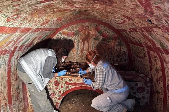"Kazı sırasında hipojenin dıştaki tonozuyla karşılaştık ve tam tonozun giriş kısmını kapatan bir lahite ait kapakla karşılaştık. Bunu kaldırdıktan sonra delikten içeriye baktığımızda bu renkli, çok muhteşem fresklerle karşılaştık. Daha sonra lahit kapağını kaldırdık ve içeriye girdiğimizde buranın molozlarla, toprakla dolu olduğunu gördük. Öncelikli olarak bu moloz ve toprak dolgusunun boşaltılmasından sonra zeminde iki iskelete rastladık. Burayı temizledikten sonra da kline üzerindeki iskeletlerle karşılaştık. Bu çok gösterişli freskler, bizi çok heyecanlandırdı. Kline üzerinde üç birey var. Bunlardan biri erkek, biri kadın ve ayak uçlarında da bir bebek var. Bunların mezar sahipleri olduğunu düşünüyoruz. Tabanda da iki tane birey vardı. Bunlardan biri muhtemelen 17-18 yaşlarında, biri de genç erişkin."
