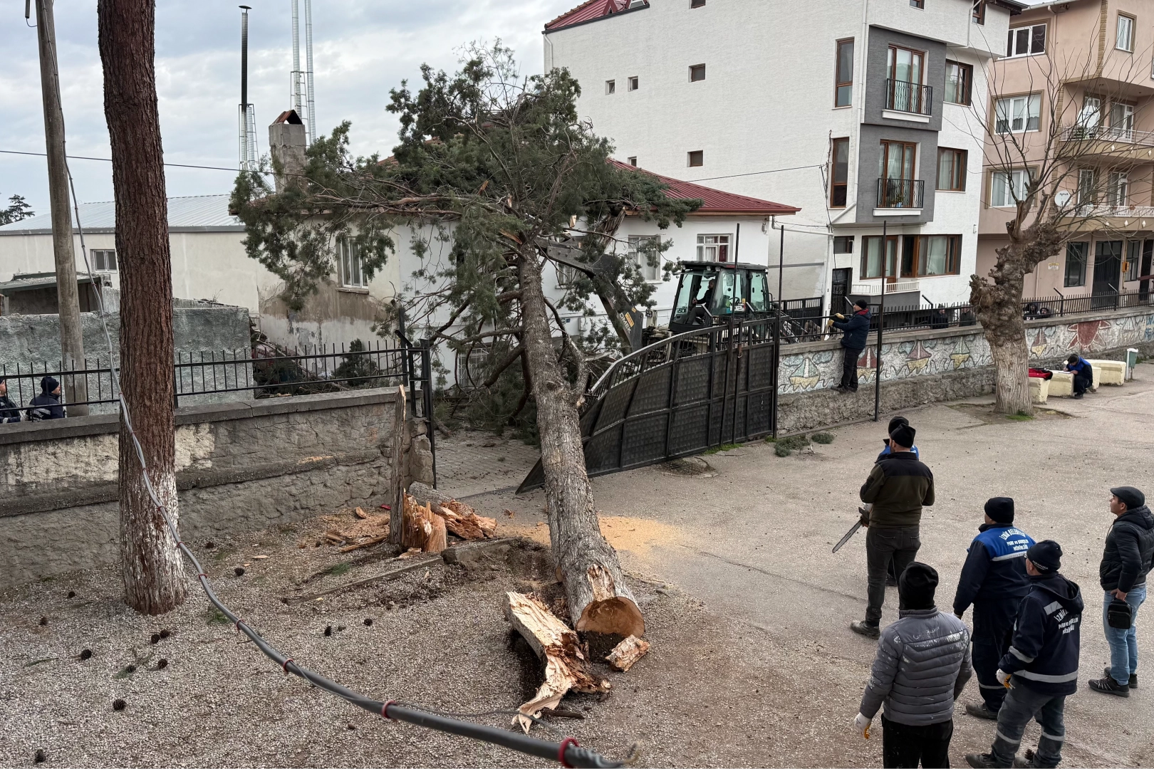 Devrilen çam ağacı nedeniyle Alparslan İlkokulu ve Ortaokulu'nun demir bahçe kapısı ile bahçe duvarlarında da zarar oluştu. Olayın, okulların tatil olması nedeniyle yaşanması muhtemel bir faciayı önlediği belirtildi. Olay sırasında okul bahçesinde öğrenci bulunmaması büyük bir tehlikenin önüne geçti. Şans eseri olayda can kaybı ya da yaralanma yaşanmazken, ihbar üzerine bölgeye gelen ekipler çevrede güvenlik önlemleri aldı. Hasar tespit çalışmaları başlatılırken, yetkililer benzer risklerin yaşanmaması için okul ve çevresindeki ağaçlarda inceleme yapılacağını bildirdi.