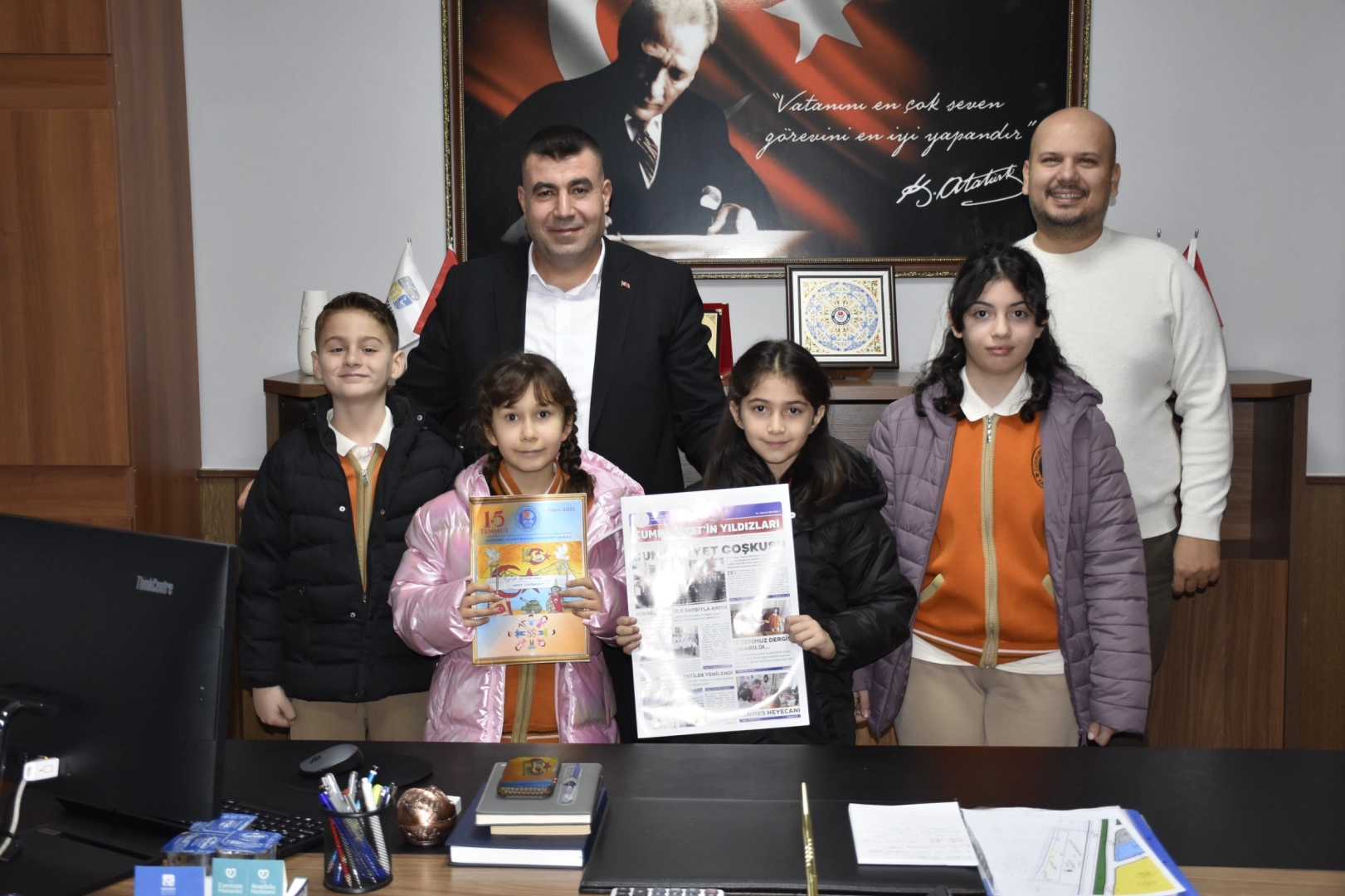 Karacabey Ticaret Borsası Cumhuriyet İlkokulu 3. ve 4. sınıf öğrencileri tarafından hazırlanan dergi ve okul gazetesi, Belediye Başkan Yardımcıları İlyas Aksoy ve Bora Akın’a tanıtıldı. Öğrencilerin özverili çalışması takdir toplarken, Karacabey Belediyesi okul gazetesinin ilk abonesi oldu. Karacabey Ticaret Borsası Cumhuriyet İlkokulu’nda öğrenim gören 3. ve 4. sınıf öğrencileri, eğitim hayatlarına değer katan örnek bir çalışmaya imza attı. Öğrenciler, öğretmenlerinin rehberliğinde hazırladıkları dergi ve okul gazetesinin tanıtımı kapsamında Karacabey Belediyesi’ni ziyaret ederek Belediye Başkan Yardımcıları İlyas Aksoy ve Bora Akın ile bir araya geldi. Ziyarette öğrenciler, Kasım ayında 15 Temmuz Milli Birlik Günü dolayısıyla hazırladıkları dergiyi ve Aralık ayında yayımlanan "Cumhuriyet’in Yıldızları" isimli okul gazetelerini tanıttı. Okul gazetesi; okulda gerçekleştirilen eğitim, kültür ve sosyal faaliyetlerin yanı sıra Karacabey genelinde düzenlenen etkinliklere de yer vermesiyle dikkat çekti. İçeriğiyle dolu dolu olan gazete, öğrencilerin hem araştırma hem de yazma becerilerini geliştirmelerine önemli katkı sağladı. Öğrenciler ve öğretmenler tarafından yapılan açıklamada, okul gazetesinin her ay düzenli olarak yayımlanacağı bildirildi. Bu kapsamda Karacabey Belediyesi, "Cumhuriyet’in Yıldızları" okul gazetesinin ilk abonesi olarak eğitime ve öğrencilerin üretken çalışmalarına verdiği desteği bir kez daha ortaya koydu. Öğrencilerin farklı kurumlara yönelik ziyaretlerinin de önümüzdeki süreçte devam edeceği belirtildi. Ziyarette Okul Müdürü İbrahim Yılmaz, 3/A Sınıfı Öğretmeni Fahri Öz ve 4/C Sınıfı Öğretmeni Seniye Doğan da yer aldı. Belediye Başkan Yardımcıları İlyas Aksoy ve Bora Akın, böylesine anlamlı ve takdire şayan bir çalışmaya imza atan öğrencileri tek tek tebrik etti. Başkan Yardımcıları İlyas Aksoy ve Bora Akın, çocukların küçük yaşta sorumluluk alarak üretmelerinin ve toplumsal konulara duyarlılık göstermelerinin son derece kıymetli olduğunu vurguladı. Karacabey Belediyesi olarak Belediye Başkanı Fatih Karabatı’nın öncülüğünde eğitime, çocukların fikri, kültürel ve sosyal gelişimine katkı sunan her çalışmanın destekçisi olmaya devam edeceklerini vurgulayan Belediye Başkan Yardımcıları İlyas Aksoy ve Bora Akın, küçük yaşta sorumluluk alarak üreten, araştıran ve kendini ifade edebilen bireyler yetişmesinin son derece kıymetli olduğunu ifade etti. Öğrencilerin bu anlamlı ve örnek çalışmalarının artarak devam etmesini temenni eden Aksoy ve Akın, emeği geçen öğretmenlere ve okul yönetimine teşekkür ederek tüm öğrencilere eğitim hayatlarında başarılar diledi.