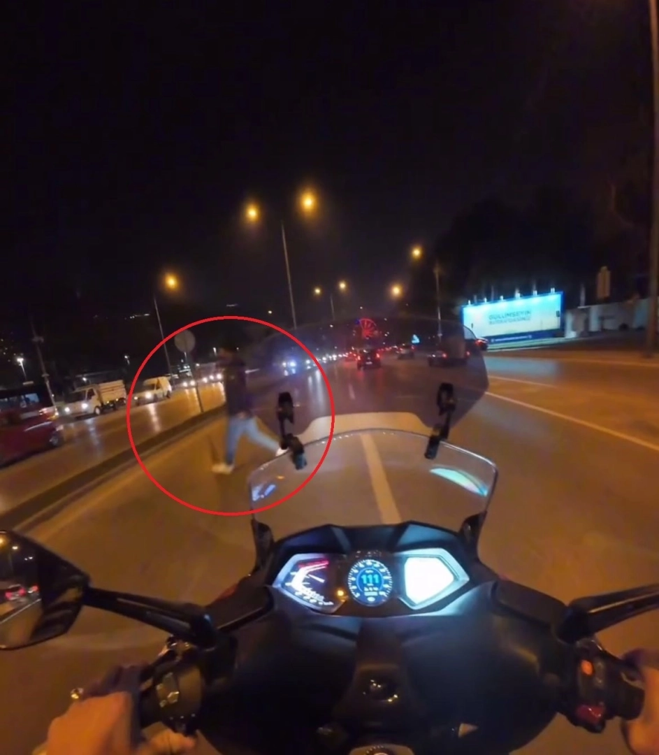 Merkez Osmangazi ilçesi Merinos Kavşağı yakınlarında motosikletliyle seyir halindeki bir sürücü 100 kilometreyi aşan hızla ilerlediği esnada anayolda karşıya geçmek isteyen kişiyi son anda fark etti. Bir anlık refleks ile yaptığı manevra sonrası kazayı teğet geçen motosiklet sürücüsü, panik dolu anlar yaşadı. Facianın teğet geçtiği anlar ise kameraya anbean yansıdı.