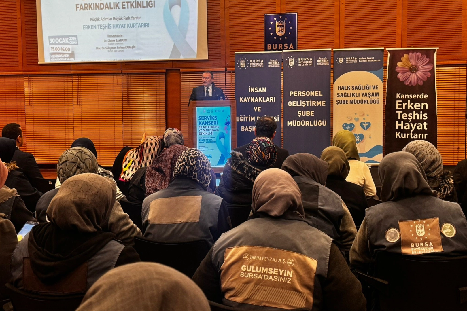 Ocak ayının 'Serviks Kanseri Farkındalık Ayı' olarak kabul edilmesi kapsamında, Bursa Büyükşehir Belediyesi tarafından kadın çalışanlara yönelik ‘Serviks Kanseri Bilinçlendirme ve Farkındalık Etkinliği' düzenlendi. İnsan Kaynakları ve Eğitim Dairesi Başkanlığı ile Sağlık İşleri Dairesi Başkanlığı iş birliğinde, İl Sağlık Müdürlüğü'nün desteğiyle gerçekleştirilen program, Atatürk Kültür Merkezi Merinos Yerleşkesi'nde yapıldı. Kadınlar arasında en sık görülen kanser türlerinden biri olan rahim ağzı kanserinin, düzenli tarama testleri sayesinde büyük oranda önlenebildiği ya da erken evrede teşhis edilebildiği vurgulanan etkinlikte, hastalıkla ilgili toplumsal farkındalığın artırılmasının önemi ele alındı. Programda Dr. Didem Bayrakçı, serviks kanseri taramaları, HPV testi ve smear testinin erken teşhisteki rolüne ilişkin bilgiler verdi. Doç. Dr. Süleyman Serkan Karaşin ise rahim ağzı kanserinin nedenleri, risk faktörleri, korunma yöntemleri ve güncel tedavi yaklaşımlarını katılımcılarla paylaştı. Sunumların ardından katılımcılar, merak ettikleri konular hakkında uzmanlara soru sorma imkânı buldu. Etkinliğe katılan Bursa Büyükşehir Belediyesi Genel Sekreter Yardımcısı Mehmet Emin Direkçi, rahim ağzı kanserinin önlenebilir bir hastalık olduğuna dikkat çekerek, "Kadınların sağlık konusunda bilinçlenmesi, güçlü ve sağlıklı bir toplumun temelini oluşturur. Erken teşhis hayat kurtarır ve bu bilincin toplumun her kesimine yayılması büyük önem taşımaktadır" dedi. Direkçi, Bursa Büyükşehir Belediyesi olarak önleyici sağlık hizmetlerini ve farkındalık çalışmalarını kararlılıkla sürdürdüklerini ifade etti.