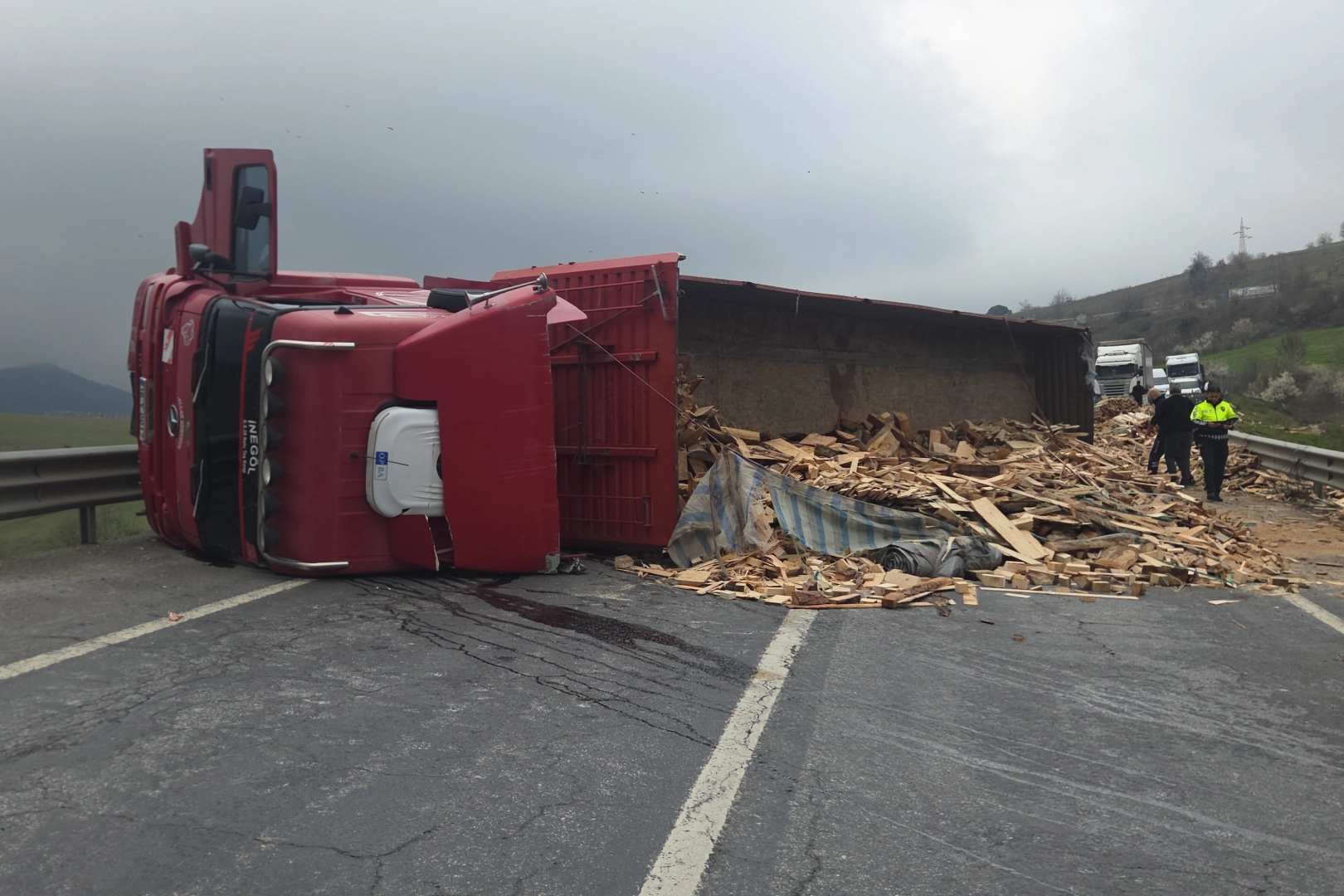 Kaza, Yalova-Bursa kara yolu Süpürgelik mevkiinde meydana geldi. Yalova istikametinden Bursa istikametine seyreden İbrahim Taşcan (40) yönetimindeki 16 Y 0017 plakalı tahta yüklü tır, bilinmeyen bir nedenle kontrolden çıkıp devrilerek sürüklendi. Kazada sürücü hafif yaralanırken, tırın kasasındaki tonlarca tahta yola saçıldı. Yolu tamamen kapatan kaza nedeniyle Yalova-Bursa yolunda trafik durdu. Olay yerine sağlık ve trafik ekipleri sevk edildi. Yaralı sürücü ilk müdahalenin ardından hastaneye kaldırıldı. Bursa yolunun yeniden trafiğe açılabilmesi için çalışmalar hızla devam ediyor.