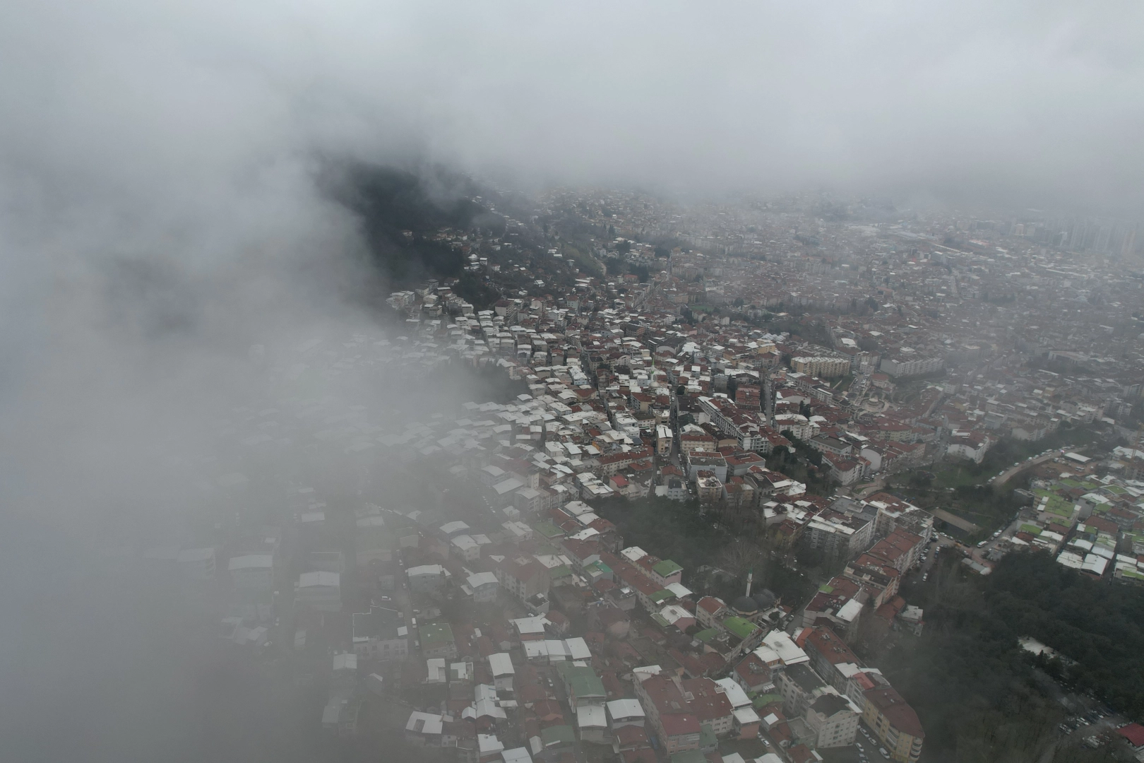 Özellikle Uludağ yamaçlarından şehir merkezine doğru ilerleyen sis bulutları, kenti adeta beyaz bir örtüyle kapladı. Sis şehir merkezine kadar ulaşmasına rağmen trafikte görüş mesafesini olumsuz etkileyecek bir yoğunluğa ulaşmadı. Ortaya çıkan etkileyici manzaralar dron ile havadan görüntülendi.