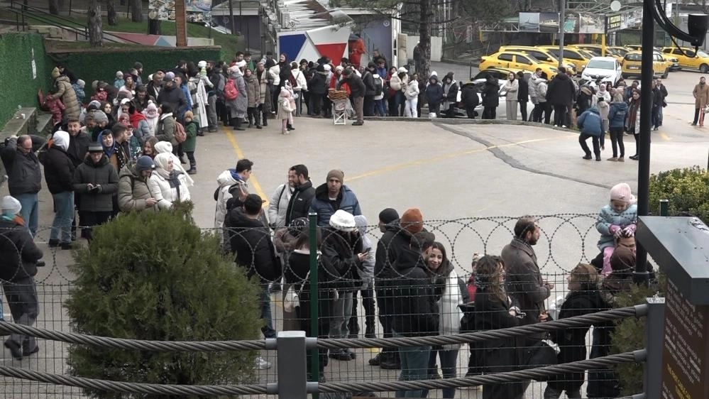 Hafta sonu Uludağ'da, otelde konaklayanların yanı sıra günübirlikçilerin de gelmesiyle yoğunluk yaşanıyor. Kimi kendi aracıyla zirvenin yolunu tutarken, kimi ise araç trafiğine takılmamak ve Bursa manzarasını izlemek için teleferiğe yöneldi. Sabahın ilk saatleriyle vatandaşların akın ettiği teleferikte, metrelerce kuyruk oluştu.Güvenliğin belli sayıda içeri aldığı teleferiğin önünde kuyruk uzadıkça uzadı. Zirvedeki kar kalınlığı 50 santimetreyi geçerken, hava sıcaklığı ise eksi 6 derece olarak açıklandı.Güzel bir hafta sonu için zirveye çıkmak istediklerini belirten vatandaşlar, yaklaşık yarım saattir kuyrukta olduklarını ancak arkadaşlarla zirveye teleferikle çıkmanın farklı bir deneyim olacağını söyledi.Gidiş dönüş bilet fiyatının tam 350, öğrencide 175 olduğu teleferik tesisleri, akşam 19.00’a kadar hizmet veriyor.