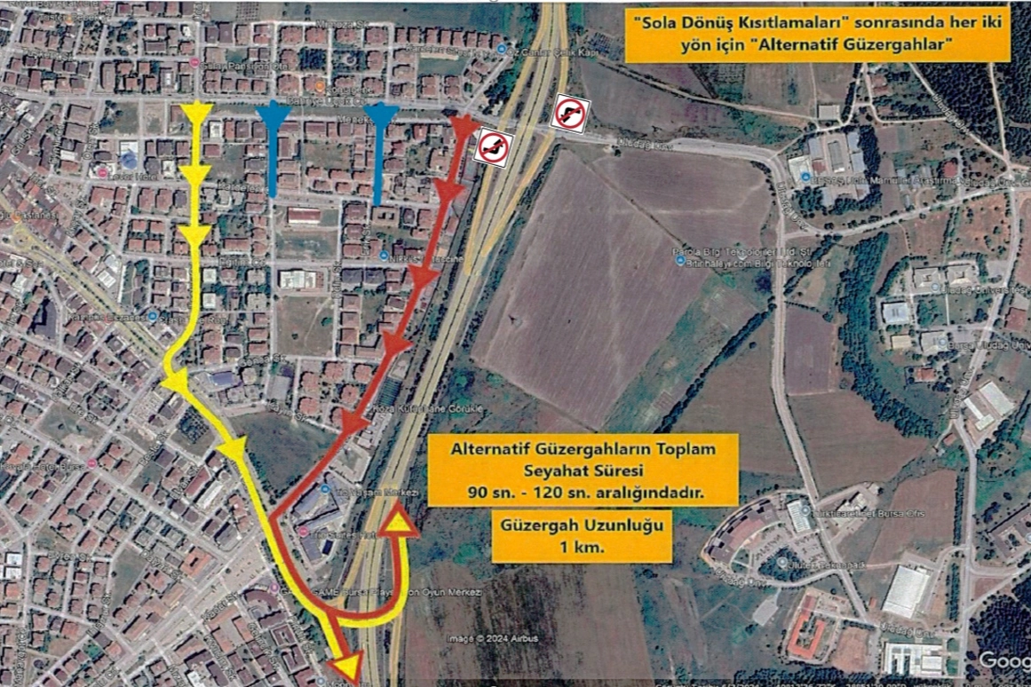 Bursa Büyükşehir Belediyesi Ulaşım Dairesi Başkanlığı Trafik Şube Müdürlüğü tarafından Uludağ Üniversitesi-Görükle bağlantı kavşağındaki yoğunluğu ve bekleme sürelerini azaltmak amacıyla yapılan inceleme neticesinde; UKOME kurulunun 28.11.2025 tarih ve 263. Sayılı kararı ile 30 Aralık 2025 tarihinden itibaren Nilüfer İlçesi Görükle Mahallesi Bahriye Üçok Caddesi ve Uludağ Üniversitesi kesişim noktasında bulunan sinyalize kavşak içerisinde Doğu – Batı yönünde sola dönüş yasağı uygulamasına başlanacaktır. Sürücülerin kavşak bölgesindeki trafik işaret ve işaretçilerine uyması ve belirtilen alternatif güzergahları tercih etmeleri gerekmektedir.