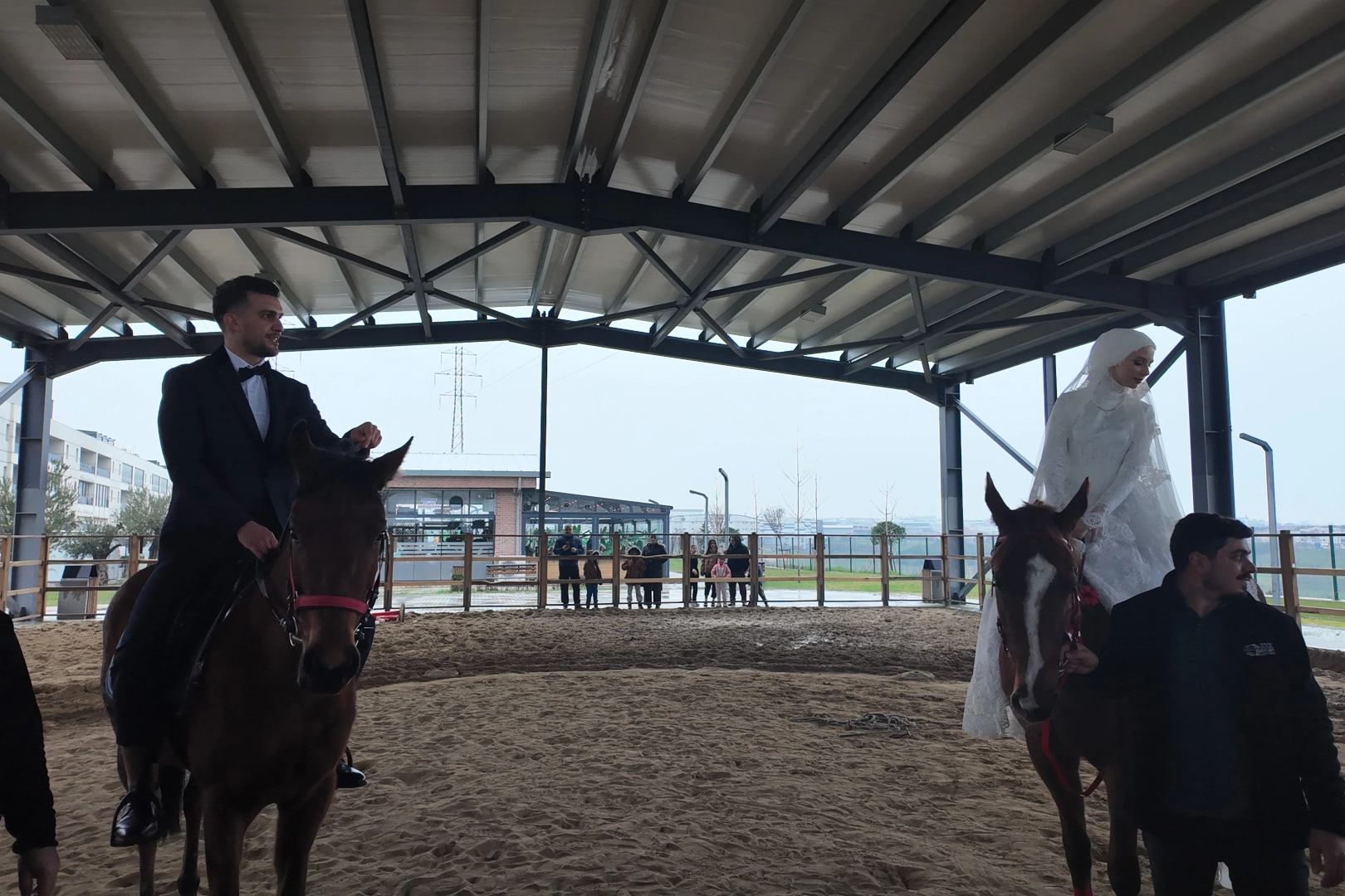 Dün, Esenyurt’ta Behçet Demir ve Dilara Eren çifti sıra dışı bir organizasyon ile nikah kıyarak dünya evine girdi. Esenyurt’ta bir süre önce belediyeye ait at binicilik tesisinde tanışan Behçet Demir ve Dilara Eren, aldıkları evlilik kararının ardından klasik bir nikah töreni yerine ortak tutkularını yansıtan bir tören yapmak istedi. Gelinlik ve Damatlıkla ata binen çift, çevredekilerin şaşkın bakışlarıyla dünya evine girdi. "ASLINDA ŞAHİDİ DE AT YAPACAKTIK AMA KABUL ETMEDİLER" Damat Behçet Demir, "İlk defa evleniyorum. Benim normal evlenmem uygun olmazdı. Atın üzerinde evlenmem şarttı. Eşim de çok iyi at biner. O yüzden böyle bir şey uygun gördük. Sağ olsun eşim de bunu uygun gördü. Aslında nikah şahidini de at yapacaktık ama bunu kabul etmediler maalesef. O yüzden nikah şahidimiz insanlar oldu. Atlarla beraber güzel bir nikah kıyacağız" dedi. "BURADA TANIŞTIK. O YÜZDEN ANLAMLI OLACAĞINI DÜŞÜNDÜK" Eşiyle binicilik tesislerinde tanıştıklarını ifade eden Dilara Eren ise, "Biz burada tanıştık. O yüzden anlamlı bir şey olacağını düşündük. Burada nikah kıymaya karar verdik" diye konuştu.