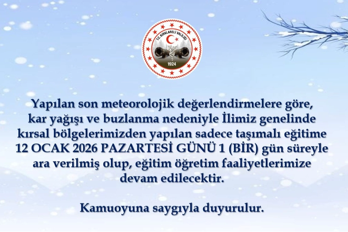Yetkililer, alınan kararın öğrenci ve vatandaşların can güvenliğini sağlamak amacıyla alındığını belirtirken, taşımalı eğitim kapsamı dışında kalan okullarda eğitim-öğretim faaliyetlerinin planlandığı şekilde devam edeceğini bildirdi. Valilikten yapılan açıklamada, hava şartlarının yakından takip edildiği ve gelişmelere göre kamuoyunun bilgilendirileceği ifade edilerek, vatandaşların dikkatli ve tedbirli olmaları istendi.