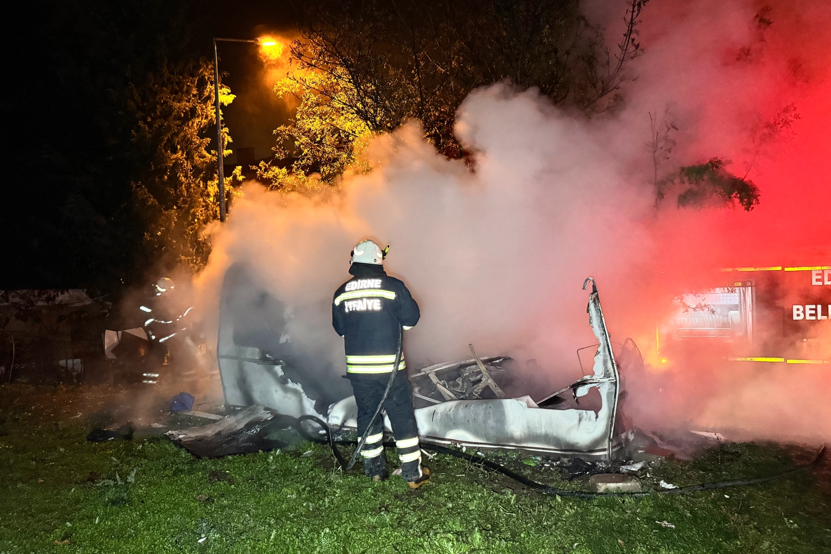 Edirne’nin Yeniimaret Mahallesi’nde bir karavanda yaşayan Fatih Dövüncü gece geç saatlerde annesinin mezarına gitti. Dövüncü mezarlıktayken yaşadığı karavanda yangın çıktı. Alev topuna dönen karavan, saniyeler içinde küle döndü. İhbar üzerine olay yerine itfaiye ve ambulans sevk edildi. İtfaiye ekipleri alevlere müdahale ederken, Dövüncü’nün karavanda olduğunu düşünen mahallelinin endişeli bekleyişi başladı. Mahallelinin korkulu gözlerle bekleyişi sürürken Dövüncü, mezarlıktan çıkıp yangın yerine geldi. Dövüncü bir hisle mezarlığa annesini ziyarete gitmese belki de yanarak hayatını kaybedeceğini ifade etti. Polis, yangınla ilgili inceleme başlattı.
