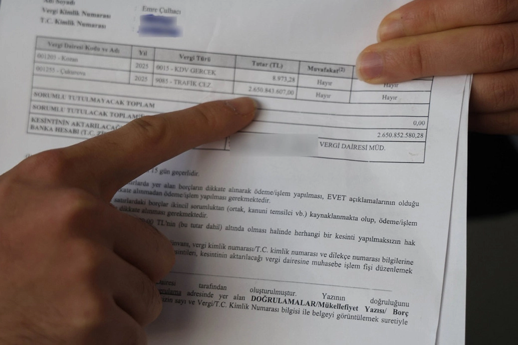 Kozan ilçesinde yaşayan Avukat Emre Çulhacı, adına 2 milyar 650 milyon 843 bin 607 lira tutarında trafik cezası kaynaklı vergi borcu göründüğünü öğrenince hayatının şokunu yaşadı. Türkiye'de geçen yıl kesilen toplam trafik cezalarının yaklaşık 30'da birine denk gelen rakam karşısında şoku atlatan avukat Çulhacı, yaptığı görüşmelerle hatayı düzelttirdi.