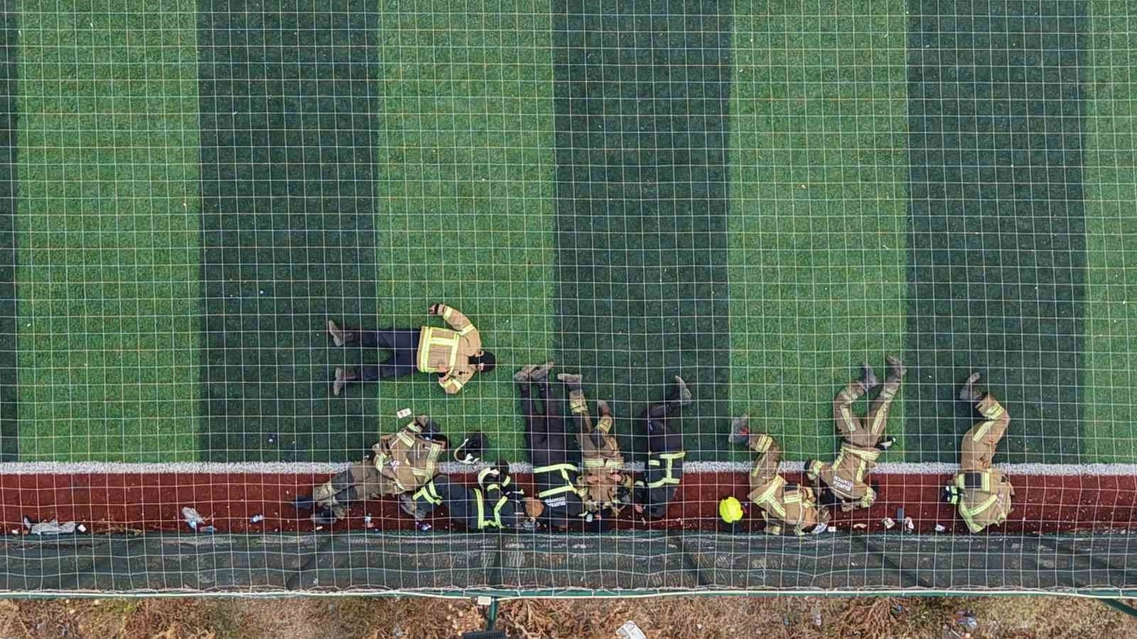 Bursa’da üç ilçeyi etkileyen ve 3 köyün boşaltılmasına sebep olan yangında 12 saat boyunca fedakarca çalışan ve ormanın derinliklerine girip alevleri bastıran itfaiye erleri bir halı sahada istirahate çekildi. Halı sahada zor şartlarda birkaç saatliğine dinlenip yeniden göreve gitmek için hazırlanan itfaiye erleri dikkat çeken görüntüler oluşturdu.
