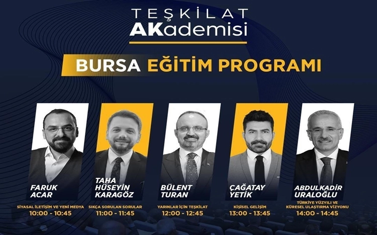 AK Parti Ar-Ge ve Eğitim Başkanlığı tarafından düzenlenen "Teşkilat AKademisi Bursa Eğitim Programı", 26 Temmuz 2025 Cumartesi günü Bursa’da gerçekleştirilecek. Merinos Atatürk Kongre ve Kültür Merkezi Osmangazi Salonu’nda yapılacak program, siyasetin önemli isimlerini teşkilat mensuplarıyla buluşturacak.