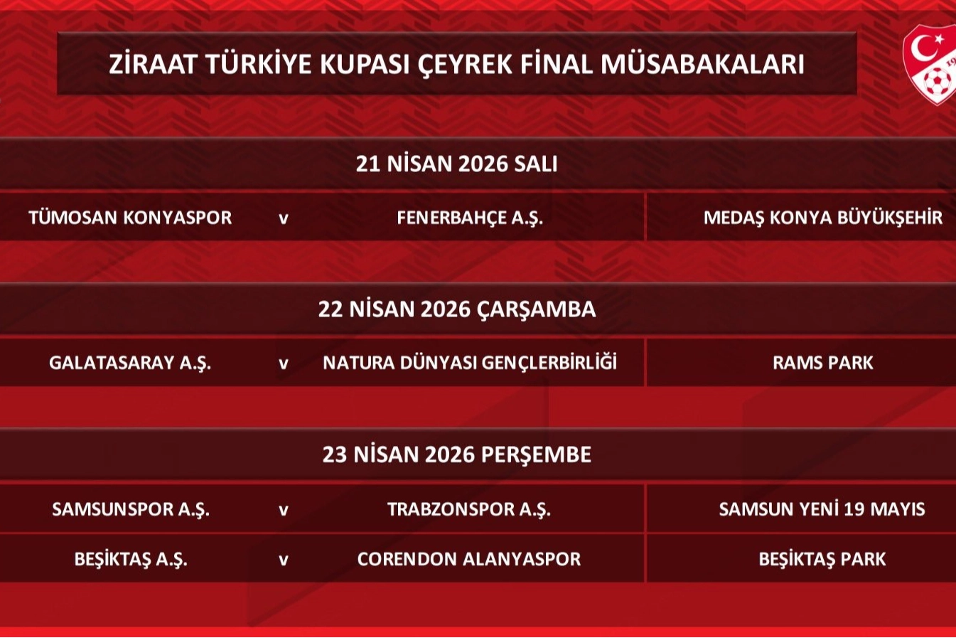 Türkiye Futbol Federasyonu'nun (TFF) internet sitesinden konuya ilişkin yapılan açıklamada, çeyrek final müsabakalarının 21, 22 ve 23 Nisan tarihlerinde oynanacağı belirtildi. Ziraat Türkiye Kupası'nda çeyrek final programı şöyle: 21 Nisan Salı 20.30 Konyaspor - Fenerbahçe 22 Nisan Çarşamba 20.30 Galatasaray - Gençlerbirliği 23 Nisan Perşembe 18.45 Samsunspor - Trabzonspor 20.45 Beşiktaş - Corendon Alanyaspor