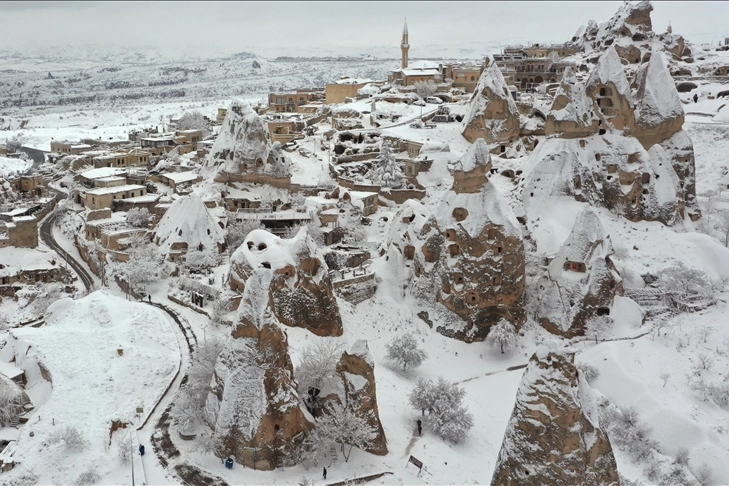 UNESCO Dünya Mirası Listesi'nde yer alan bölgede, turistlerin uğrak noktalarından Göreme, Uçhisar ve Ortahisar beldelerindeki peribacaları ile doğal kaya oluşumları, kar altında farklı bir manzaraya büründü.