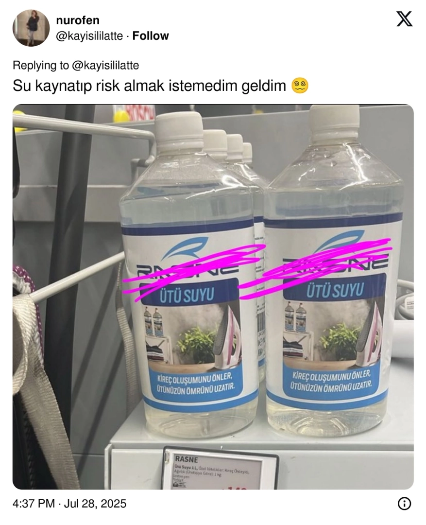 Market raflarında sıkça gördüğümüz ürünlerden biri de ütü suyu. Ütünün su haznesine zarar vermemesi için kireçsiz su önerilirken, artık özel olarak 'ütü suyu' adıyla satılan bu ürün, birçok kişi tarafından sosyal medyada fark edildi.