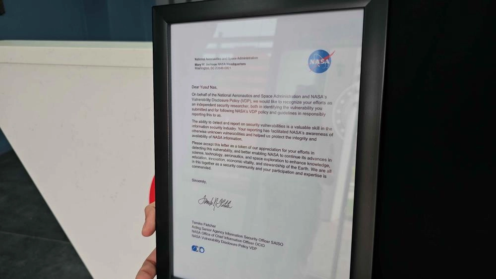 Ulusal Havacılık ve Uzay Dairesinin (NASA) sistemlerinde kritik güvenlik açığını tespit eden üniversite öğrencisi Yusuf Nas, NASA onur listesine adını yazdırarak takdir mektubuyla ödüllendirildi.