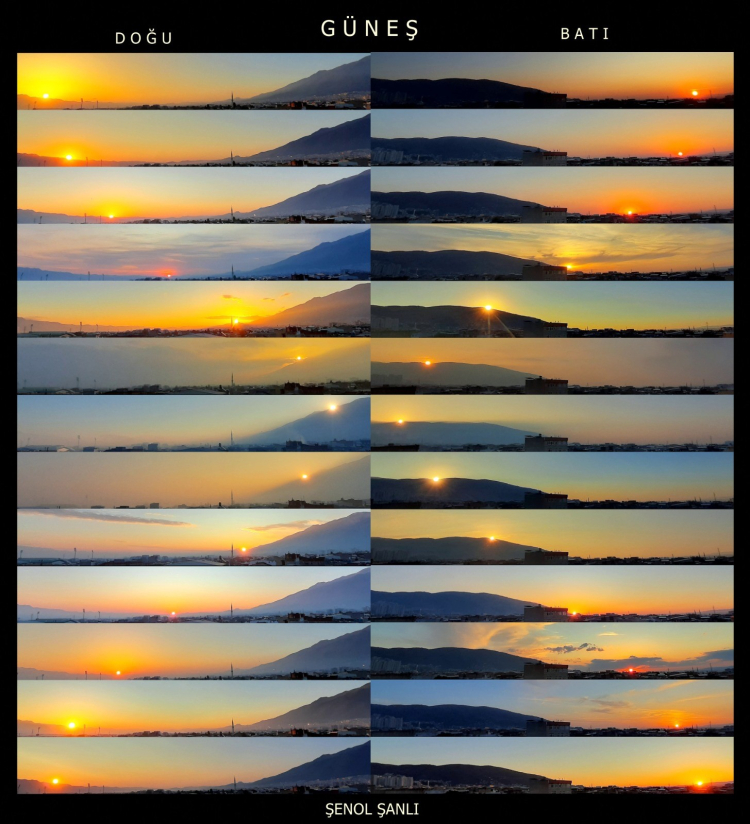 Bursa'da gökyüzü meraklısı Şenol Şanlı, 1 yıl boyunca her ay doğu ve batı ufuklarından çektiği güneş fotoğraflarını tek karede birleştirerek kış ve yaz gündönümleri arasındaki hareketi gözler önüne serdi.