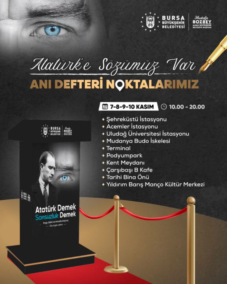 “Atatürk’e Sözümüz Var” sloganıyla düzenlenen etkinlik kapsamında, 7-10 Kasım tarihleri arasında kentin 10 farklı noktasında anı defteri noktaları oluşturuldu. Bursa halkı, bu noktalarda Atatürk’e olan sevgisini, özlemini ve duygularını kaleme alarak kent belleğine kaydedebilecek.
