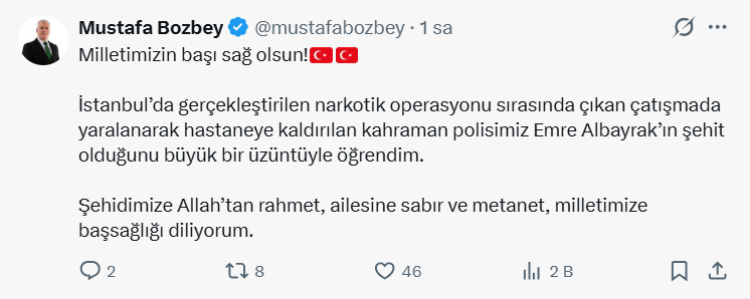 Bozbey mesajında, “Milletimizin başı sağ olsun! İstanbul’da gerçekleştirilen narkotik operasyonu sırasında çıkan çatışmada yaralanarak hastaneye kaldırılan kahraman polisimiz Emre Albayrak’ın şehit olduğunu büyük bir üzüntüyle öğrendim. Şehidimize Allah’tan rahmet, ailesine sabır ve metanet, milletimize başsağlığı diliyorum.” ifadelerine yer verdi.