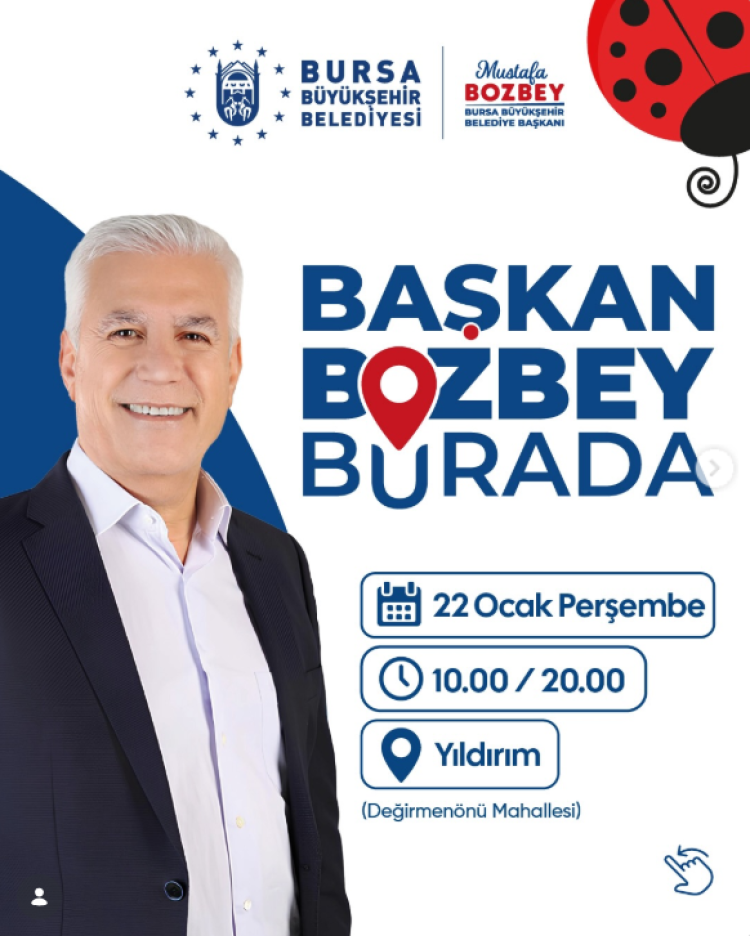 Daha önce planlanan ancak Bursa Büyükşehir Belediye Başkanı Mustafa Bozbey’e yönelik saldırı nedeniyle yarıda kalan mahalle buluşmasının yeni tarihi belli oldu. Başkan Bozbey, Bursalılarla yeniden bir araya gelmek üzere 22 Ocak 2026 Perşembe günü Yıldırım ilçesine geliyor.