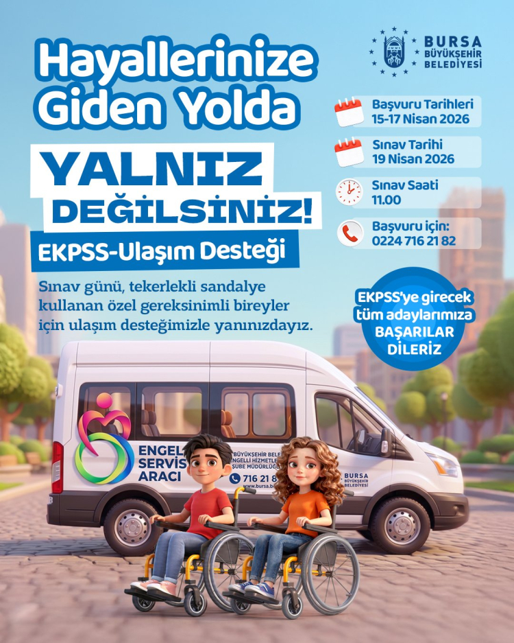 Bursa Büyükşehir Belediyesi, Engelli Kamu Personeli Seçme Sınavı’na katılacak adaylar için önemli bir sosyal destek uygulamasını hayata geçirdi. Belediye, özellikle tekerlekli sandalye kullanan özel gereksinimli bireylerin sınav günü ulaşım sorunu yaşamaması adına ücretsiz servis hizmeti sunacağını duyurdu.