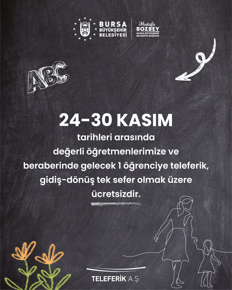 “Başöğretmenimiz Gazi Mustafa Kemal Atatürk başta olmak üzere, eğitimli nesiller ve aydınlık yarınlar için emek harcayan tüm öğretmenlerimizin 24 Kasım Öğretmenler Günü’nü kutluyoruz. 24-30 Kasım tarihleri arasında öğretmenlerimiz ve beraberlerinde getirecekleri bir öğrenci için teleferik ücretsiz olacaktır. İyi ki varsınız!”
