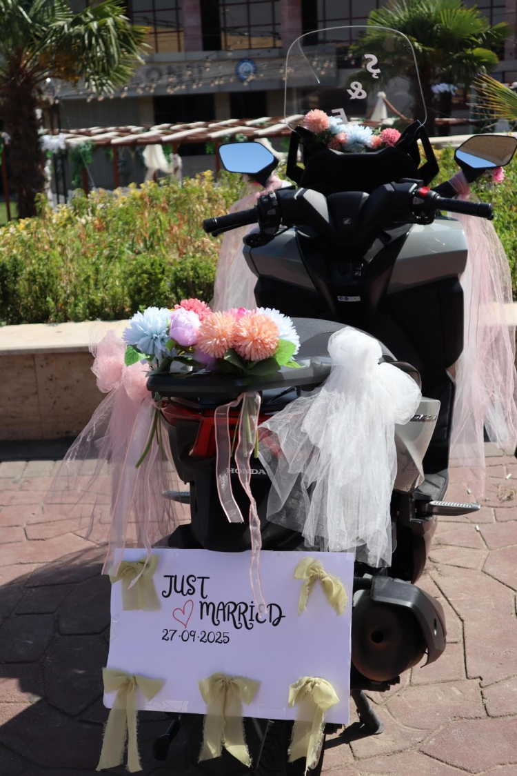 Nikâhın ardından motosikletlerini çiçek ve tüllerle süsleyen çift, düğün konvoyuna ilginç bir renk kattı. Gelinlik yerine beyaz takım tercih eden Şule Albayrak Çağın ve damat Emre Çağın, süslenmiş motosikletleriyle şehir turuna çıktı.
